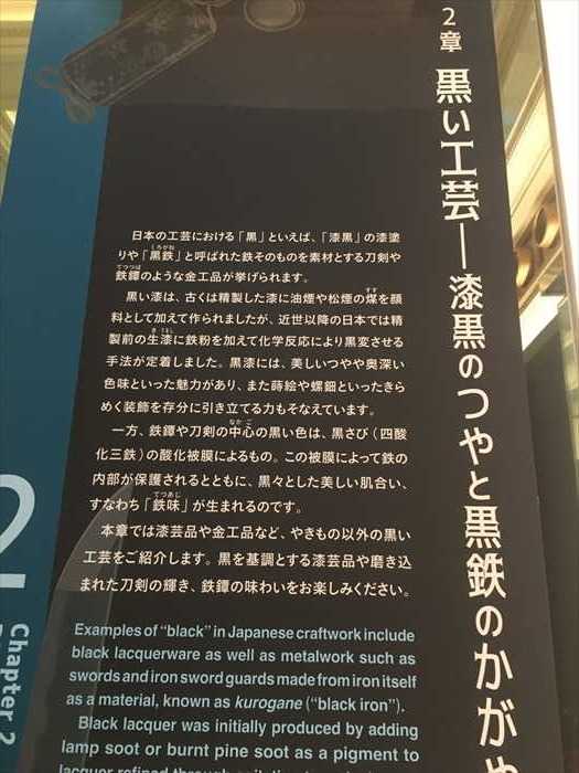 2章 黒い工芸---漆黒のつやと黒鉄のかがやき日本の工芸における「黒」といえば、「漆黒」の漆塗りや「黒鉄」と呼ばれた鉄そのものを素材とする刀剣や鉄鐔のような金工品が挙げられます。黒い漆は、古くは精製した漆に油煙や松煙の煤を顔料として加えて作られましたが、近世以降の日本では精製前の生漆に鉄粉を加えて化学反応により黒変させる手法が定着しました。黒漆には、美しいつやや奧深い色味といった魅力があり、また蒔絵や螺鈿といったきらめく装飾を存分に引き立てる力もそなえています。一方、鉄鐔や刀剣の中心の黒い色は、黒さび(四酸化三鉄)の酸化被膜によるもの。この被膜によって鉄の内部が保護されるとともに、黒々とした美しい肌合い、すなわち「鉄味」が生まれるのです。本章では漆芸品や金工品など、やきもの以外の黒い工芸をご紹介します。黒を基調とする漆芸品や磨き込まれた刀剣の輝き、鉄鐔の味わいをお楽しみください。3章 天目と黒いやきもの東洋の黒いやきものには4000年以上の歴史があります。中国の黒いやきもののはじまりは、新石器時代の山東省における大汶ロ文化や山東龍山文化して作られた精緻な黒色の土器てある「黒陶」に求められます人為的に釉薬を施した陶器が出現した頃から、釉中に自然に含まれる鉄分により黒掲色を呈するものがありましたが、漆黒に近い黒い釉薬は後漢時代、青磁生産が盛んな江南で完成しました。以降江南を中心に生産された黒釉は、南北朝時代以降北方や各地に生産地が広がっていきました。宋代以降、建窯などの江南の諸窯では黒釉をベースにした天目茶碗が焼かれたほか、華北の磁州窯系諸窯でも黒融磁が生産され、線影りや掻落し、あるいはより鉄分の濃い融薬による銹花(斑)といった加飾技法が発達しました。清代には高火度焼成による黒釉以外にも、低火度による釉上彩の黒が注目され、黒地のきもののヴァリエーションが広がりました。やきもの先進国の中国から絶えず刺激をうけた日本では、鎌倉時代より尾張瀬戸で天目茶碗が焼かれ、挑山時代には中国の三彩の技術をルーツとする長次郎により黒樂茶碗が生み出され、受け継がれています。本章では、中国古代の黒陶から、宋・元時代の天目茶碗をはじめとする黒釉陶磁から東洋の伝統的陶芸技術の極みといえる清時代のやきものの黒、また挑山・江戸時代の日本へとつながっていく黒いやきものの流れを紹介します。黒釉盒37.貴婦人の化粧道具黒釉盒北宋~金時代(11 ~ 12世紀)38.黒地に咲く鉄銹の花黒釉銹斑共蓋小壺磁州窯系 金時代(12 ~ 1 3世紀)No. 37は艶やかな黒釉が施された円形の蓋物で、化粧品を入れたものだろう。内部には、小さな円形の蓋物、百合ロの皿、花弁状の装飾を施した容器の3つが固定されて収まっている。底裏は腰以下全て露胎で、低い輪高台を削り出している。NO. 38は黒釉上に鉄分濃度の高い鉄釉を置いて赤褐色の斑文を表している。河北省の磁州窯と類似の技術・意匠を展開した河南省周辺の磁州窯系の作だろう。右:黒釉白縁碗 磁州窯系 北宋~金時代(11 ~ 12世紀)上:黒釉油滴碗 磁州窯系 北宋~金時代(12 ~ 13世紀)下:黒釉鉢 磁州窯系 元時代(13 ~ 14世紀)黒陶磨光文鼎戦国時代(前4 ~前3世紀)黒陶磨光文豆戦国時代(前4 ~前3世紀)黒陶磨光文鼎戦国時代(前4 ~前3世紀)青鋼器の鼎を写した明器(実用性のない副葬品)。焼成前に表面を研磨することで光沢の差をつけ文様を表す「磨光文」という技法により、山や波濤のような幾何学文や雲気文を施し、燻し焼きによって器面に煤を吸着させ、黒く染めている。紀元前310年頃とされる河北省平山県中山国王募出土の黒国鼎に近似した作風である。黒陶磨光文豆戦国時代(前4 ~前3世紀)黒陶は還元焔焼成した土器である。焼成中の窯内に穀物などの有機物をいれ、燻し焼きすることで発生させた煤(炭素)を器表に吸着させて作る。「豆」は、食物を盛る蓋寸きの高杯で、本作は青鋼か漆塗りの彝器(祖先の宗廟に供えた祭祀用の器)を模したもの。NO. 27の鼎と作風が酷似し、一具をなしていたものと考えられる。三彩足噛馬唐時代(7 ~ 8世紀)ズームして三彩足噛馬唐時代(7 ~ 8世紀)本作は、悍馬が自らの脚を噛んで血を流すという古伝に基いた姿態と考えられ、鉄泥を塗った上に褐釉をかけて黒馬を表す。唐代の三彩に表された馬たちは、西方から輸入され、王侯貴族に所有された馬に実際に施された化粧や節り付けを再現したものだろう。馬具はひときわ豪華で、面懸と胸懸には大きな房状の飾り、尻懸には大きな花形のメダイオンをつけ、明るい褐色と蝋抜きで精緻な装節金具の輝きを表している。黒釉線彫蓮唐草文梅瓶磁州窯系 金~元時代(13 ~ 14世)黒釉線彫蓮唐草文梅瓶磁州窯系 金~元時代(13 ~ 14世)きめ細かな素地に黒をたつぶりと掛け、素地の層まで線影り文様を刻んでおり、やや黄色く見える背景に黒い文様が浮かび上がる。胴部に帯状に表された蓮唐草は蓮花と荷葉を3つ連結したもので、タッチにややたどたどしさが感じら