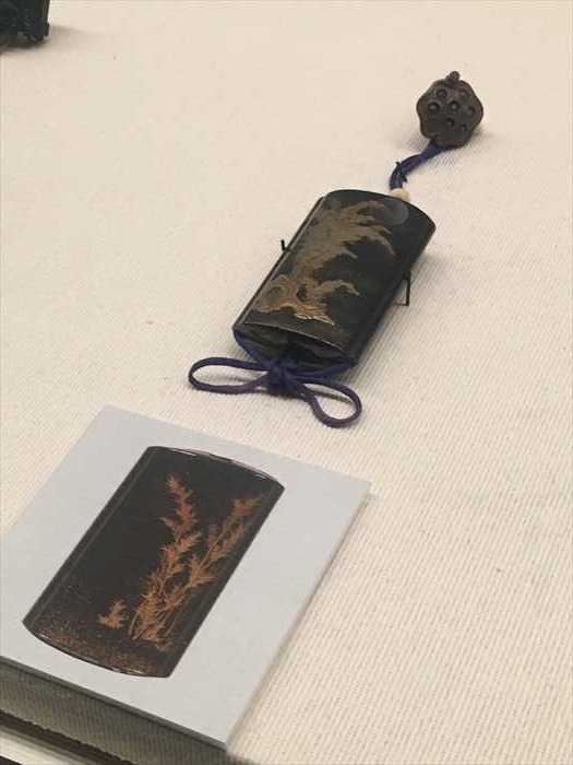 16.月に竹林蒔絵印籠・木彫蓮実根付印籠:「法橋胡民【花押】」銘根付:「連車」銘中山胡民 江戸時代( 19世紀)竹林蒔絵印籠・木彫蓮実根付16.月に竹林蒔絵印籠・木彫蓮実根付印籠:「法橋胡民【花押】」銘根付:「連車」銘中山胡民 江戸時代( 19世紀)青貝徴塵の月光にご注目!月夜の竹藪を表した印籠。銀の研出藤絵でぼかしを加えながら朧な月を描き、研出第絵と付描を重ねて重層的な竹藪を表す。地面には青貝を蒔いて月光の反映を表現し、幻想的な効果を高めている。中山胡民(1808 ~ 70)の原羊遊斎の門人。片輪車の手箱などをはじめとする羊遊斎のテーマや作風を継承し、松平不昧や酒井抱ーとも交流した。後に法橋に叙せられた。17.太平有象唐墨形火炎太鼓象嵌印籠黒檀彫衝立に唐子根付印籠:「半山製【野】」銘望月半山 江戸時代(18世紀) /根付:江戸時代(18 ~ 19世紀)17.太平有象唐墨形火炎太鼓象嵌印籠黒檀彫衝立に唐子根付印籠:「半山製【野】」銘望月半山 江戸時代(18世紀) /根付:江戸時代(18 ~ 19世紀)文人の大好物!カラスミそっくりの印籠唐墨(中国製の古墨)そっくりの形の印籠で、別面には火炎太鼓を表わす。「太平有象」は天下が安泰で吉祥が現れる意の吉祥句で、周囲に楽器散らしの文様を配す。墨の欠けやひび割れまでも表現している。望月半山は宝暦頃(175~64)に活躍した小川破笠(16630~1747)の門人で、破笠の作風を継承してニ代破笠を称したという。18.宝露台唐墨形印籠(ほうろだいとうぼくがたいんろう)重ね色紙蒔絵文箱形根付印籠:「是真」銘 根付:「是真」銘柴田是真 江戸~明治時代(19世紀)表面には「寶露臺」の文字の周囲に楽器を散らす。ネットから。18.宝露台唐墨形印籠(ほうろだいとうぼくがたいんろう)重ね色紙蒔絵文箱形根付印籠:「是真」銘 根付:「是真」銘柴田是真 江戸~明治時代(19世紀)是真迫真のだましテクニックひび割れや欠けの生じた古墨そのもののように見えるが、実は木製の素地に漆塗りで出来ている。本物そっくりの質感を表現するため、黒漆に炭粉を蒔いたという。表面には「寶露臺」の文字の周囲に楽器を散らし、裏面には甘露を盛った甕を表す。明代の墨匠・方于魯(ほううろ)が刊行した自作の墨の図録『方子墨譜』に載る「寳露臺」墨の図と古代の伝説を元に独自の意匠を作り上げている。19.山水漆絵印籠(さんすいうるしえいんろう)浪に千鳥蒔絵箱形根付印籠:「梶川作【英】」銘根付:「是真」銘梶川 根付:柴田是真江戸時代( 18 ~ 19世紀)根付:江戸~明治時代い9世紀)19.山水漆絵印籠(さんすいうるしえいんろう)浪に千鳥蒔絵箱形根付印籠:「梶川作【英】」銘根付:「是真」銘梶川 根付:柴田是真江戸時代( 18 ~ 19世紀)根付:江戸~明治時代い9世紀)倹約令時代の反骨精神印籠としては異例の真っ黒な漆で中国風の山水風景が描かれ、高蒔絵により山や楼閣が巧みな凹凸をもって立体的に表される。江戸後期の天保の改革(1841~ 43)では、文化の爛熟した金銀の贅沢な使用を禁じたこの時代の印籠とも想像される。柴田是真作の根付には独特の青海波塗の波が施されている。20.団龍紫壇彫印籠江戸時代(18世紀)堆黒写しか?超絶技巧の彫り堆黒とは黒漆を厚く塗り重ねて文様を彫刻したもの。 中国では剔黒 (てきこく) という と。近づいて。20.団龍紫壇彫印籠江戸時代(18世紀)堆黒写しか?超絶技巧の彫り黒褐色の紫団壇の地に菱形雷文繋ぎを刻み、表裏に団龍文を大きく一つずつ浮き彫りにする。龍頭の向きはそれぞれ上下逆にして、変化をつけている。彫り口は鋭く精緻であり、漆芸の堆黒(幾重にも塗り重ねた漆を彫り込んで文様を表す彫漆技法のうち、表面を黒漆で塗り上げたもの)を意識したような作風である。21.太刀 銘 吉房附 雲文漆蒔絵鞘打刀拵(つけたりうんもんうるしまきえざやうちがたなこしらえ)21.太刀 銘 吉房附 雲文漆蒔絵鞘打刀拵(つけたりうんもんうるしまきえざやうちがたなこしらえ)刃長2尺1寸6分( 65.4cm )一文字吉房 鎌倉時代(13世紀) 拵:江戸時代(19世紀)八重桜のごとき刃文吉房は、鎌倉時代前期に隆盛した備前の刀工集団・福岡一文字の刀工。一派きっての丁字乱れの名人で、信房・則房とともに「備前三房」の一人に挙げられている。古来、同銘で2 ~ 3代続くとする説があり、大銘に切るのが初代、本作のような小銘は後代とされる。絢爛華麗な刃文はまさに吉房の典型作といえよう。黒塗りの中に黒い雲文が浮かび上がる「夜桜」技法の見事な打刀拵が付帯している。22智将・直江兼続の愛刀刀 大磨上げ無銘(号「後家兼光」)附 芦雁絵鞘打刀拵刃長 2尺6寸4分( 80. 0cm)伝 長船兼光 南北朝時代(14 世紀)/拵:明治(19世紀)兼光は備前長船派の嫡流で、景光の子という。本作は相州風が強く表れた南北朝時代延文(1356~61)頃の典型作。大切先で身幅広く、先反りのついた豪快な姿で、大磨上げされており、本来は三尺あまりの大太刀だったと思われる。直江兼光の愛刀で、没後は未亡人・お船rの方により主家に献上され、「後家兼光」として伝来した。江戸の蒔絵師・渡邉桃舩(1815~?)による芦雁蒔絵鞘