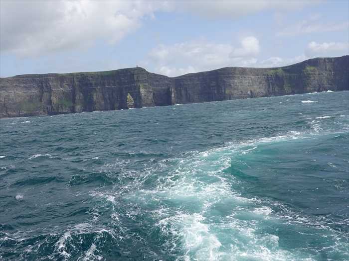 観光フェリーが、観光客用に一時停止したので、カメラを持ち、席を離れ、フェリーのデッキに出て、「Cliffs Of Moher・モハーの断崖」をカメラで追ったのであった。 先端をズームして。再び「Hag's Head」が右側に。その左に「Moher Fort Site Telegraph Station」。 ズームして。「Cliffs Of Moher・モハーの断崖」の雄大な景色を。観光フェリー船の現在地はここ。そして観光フェリーは動き出した。「Cliffs of Moher・クリフス・オブ・モアー」を再び追う。延長:約8km(北のDoolinから南のHag’s Headまで)高さ:最高214m(O'Brien’s Tower付近)成り立ち:約3億年前の石炭紀に形成された層状の砂岩・頁岩の断崖観光客数:年間約150万人(アイルランド国内2位の人気)この断崖ができたといわれているのは、なんと3億2000万年前。上部石炭紀と呼ばれる時代で、この時代は多くの地域において年中あまり気温の変化がなく、温暖な気候であった と。このモハーの断崖がある地域も例外ではなく、今よりずっと温暖であった。そしてこの地域は大きな川の河口にあたり、上流からずっと流れてきた土砂が堆積して現在のような岩の層が出来上がったと言われている。この地域は大きな川の河口であったとは言え、海から見ると、断崖の上が見事に「水平」なのが不思議。ネットから航空写真を。多くの動物が崖に生息しており、その中で鳥が多く、3万羽29種に及ぶ と。特に興味深いのが隔絶された崖とゴート島(Goat Island)に集住するニシツノメドリである。またタカ、カモメ、ウミスズメ、ウ、ワタリガラス、ベニハシガラスも生息する。「ハリーポッターと謎のプリンス」の撮影地になっていることも、有名になっているきっかけのひとつになっているとのこと。このシーン!👈️リンク崖の地層は主にナムリアン期の頁岩と砂岩であり、最古の岩石は崖下で見られる。3億年前の川筋が崖下を切って走っていた と。夕暮れに赤く輝くモハーの断崖。(ネットより)この前方の海食柱(Sea stack)は、最初は断崖にすっぽり穴が空いてその先の景色が見えているとカン違いしたのであったが・・・。断崖の手前に立つ海食柱(Sea stack)なのであった。海食柱(Sea stack)とは、海によって岩盤が侵食されて形成された、急峻な斜面を持つ柱のような形状の岩、または、そのような地形である。ほとんどの海食柱は海岸の近くに存在する。海食柱は、ゆくゆくは侵食されて消滅してしまうので、海による侵食の過程の途中と見ることもできる のだと。塔の200メートル下、海上に50メートルほど離れた場所にあり、「アン・ブラナン・モー・An Branán Mor. (Branaunmore)」と呼ばれる高さ60メートルの壮観な海食柱(Sea stack)なのであった。「An Branán Mór」 はアイルランド語で「偉大な(大きな)サケ」という意味とのことで「サケに似た形をした大きな岩」を指していると考えられるとのこと。岩肌が剥き出し地層が積み重なっているのが解る場所。ズームして。モハーの断崖の内陸側のスタート地点を。ズームして。さらに。海面上の断崖もズームして。別の断層が潜り込んでいるが如くに。 ・・・もどる・・・ ・・・つづく・・・