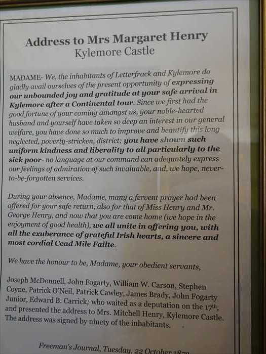 ヴィクトリア朝時代の邸宅サロン(Drawing Room)を更に見学。「Address to Mrs Margarct Henry Kylemore CastleMADAME- We, theinhabitants of Letterfrank and Kylemore do gladly avail ourselves ofthe present opportunity of expressing our unboundedjoy joy and gratitude at your safearraival in Kelemore after a Continental tour.Since we first had the good fortune of your coming amongst us, your noble hearted husband and yourself have so much to improveand beautify this long neglected ,poverty-stricken,district;you have shown such uniformkindness and liberrality to all particularly to the sick poor-no language at our commandcan adequately express ou feeling of admiration of such invaluable,and,we hope,never-to-be-forgotten services.During your absence, Madame, many a fervent prayer had been offered for your safe return, also for that of Miss Henry and Mr.George Henry, and now that you are come home(we hope in the enjoyment of good health),we all unite in offering you,with all theexuberance of grateful Irish hearts, a sincere and most cordial Cead Mile Failte.We have the honour to be, Madame,your obedient servants,Joseph McDonnell,John Fogafty, William W. Carson, Stephen Coyne, Patrick O'Neil, Patrick Cawley, James Brady, JOhn Fogalty Junior, Edward B. Carrick;who waited as a deputation on the 17th,and presented the address t0 Mrs. Mitchell Henry, Kylemore CastIe.The address was signed by ninety of the inhabitants. Freeman's Journal, Tuessday,22 October 1872」 【拝啓 令夫人 カイルモア城私たち、レターフラックおよびカイルモアの住民一同は、このたびのヨーロッパ大陸旅行から無事にご帰還なさったことに対し、言い表せぬ喜びと感謝の気持ちを表すべく、ここに筆をとりました。私たちがあなた様と、ご寛大なご主人であるミッチェル・ヘンリー氏をお迎えする幸運に初めて預かって以来、この長年打ち捨てられ、貧困にあえいでいた地方に対して、お二人は多大なる改善と美化をもたらしてくださいました。とりわけ病に苦しむ貧しい人々に対して、常に変わらぬご親切と寛大さを示してくださり、私たちは心から敬服しております。私たちの言葉では、この貴重で決して忘れられないご恩を、十分に表現することができません。ご不在の間、奥様、そしてお嬢様ミス・ヘンリーとご子息ジョージ・ヘンリーのご無事な帰還を、幾度となく祈ってまいりました。そして今、ご一家が健康でお帰りになったことを知り、私たちすべてのアイルランド人の溢れんばかりの感謝の心をもって、ここに「ケード・ミーレ・ファルチャ(Céad Míle Fáilte)=百万回の歓迎」を、心から申し上げます。(『フリーマンズ・ジャーナル』 1872年10月22日 火曜日号)】「Margaret Henry's ReplyGENTLEMEN- I feel so much overcome by your kindness that I may say,as Cromwell saidto Wolsey, "I have no power speak" I think,as a rule, ladies are not good od speakers,and I am sure that I should make vemibad one; but had I been aware sooner ourintention to present to me this beautiful,elaborate ,and eloquet address, 1 should have endeavoured to prepare a suitable reply or have asked Mr. Henry,WHo is more accustomed to making speaches than I am,to have made one for me. However, as I havedone neither the one nor the other, I must ask your simply to accept my thanks,as theycome spontaneously from my heart.I was going to begin by saying that nat the moment I could not find words to express my gratitude and sense of your kindness;but I shall not say so,for even were I able tofind words and string them fail to convey to you the feelings of my heart.Believe me,your warm welcome and kind expressions have most deeply touchedme, and will neverbe beforgotten.The brilliant display of fireworks pleased us all greatly and afforded intense pleasure tothe little ones.They were by far the best fireworks we have ever had,and were most successful,in split of the unfavourable weather.I fear I am unable to say more,and I jointed by Miss Henry and Mr.Gorge Henry,in asking you again to accept our heartfelt thanks, and to believe not only in our gratitude,but in our lasting regard. Freeman's Journal,Tuesday',22 October1872」 【Margaret Henry 夫人の返答紳士の皆様へ皆さまのお優しいお心遣いに、私はすっかり胸がいっぱいになってしまいました。クロムウェルがウォルジーに言ったように、「言葉が出ません」。そもそも、女性というものは一般的にあまり話すのが得意ではないように思いますし、私自身、きっとひどいスピーチをしてしまうでしょう。ですが、もしも皆さまがこのように美しく、丹精を込めた、そして感動的なお言葉を私に贈ってくださるおつもりだと前もって知っていたならば、私はそれにふさわしいお返事を用意するか、あるいはスピーチ慣れしているヘンリー氏に代わりに話してもらったことでしょう。しかし、どちらもしていない以上は、私の心から湧き出る感謝の気持ちを、そのままお受け取りいただくほかありません。本当は、「感謝と皆さまのご厚情に対する思いを表す言葉が見つかりません」と申し上げようとしていましたが、やめておきます。たとえ言葉が見つかっても、それらをつなぎ合わせて私の心からの想いを皆さまに十分に伝えることなど、きっとできないからです。どうか信じてください。皆さまの温かい歓迎と優しいお言葉は、私の胸を深く深く打ち、決して忘れられないものとなりました。花火の素晴らしい催しも、私たち一同たいへん楽しま