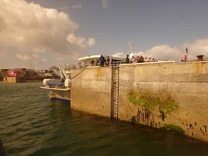 そして、この日はアイルランド3日目・6月2日(月)。早朝に起床し部屋から北大西洋方向を見る。時間は6:00。海岸沿いのタンク群を見る。3日目のこの日は、アラン諸島の一つ、イニシュモア島を観光フェリーで訪ねる旅の日。アパ-トメントから船の出るGALWAY港に向かってレンタカーで進む。前方にLough Ataria・アタリア湖が姿を表した。大西洋岸のゴールウェイ湾の先に浮かぶアラン諸島は、まさにケルト文化の中心。アイルランド語=ゲール語が日常語として使われている地域だ。アラン諸島はゴールウェイ県に属するが、クレア県のバレンと同じ石灰岩の地が広がっている。先史時代や初期キリスト教時代の古代遣跡が多く、アイルランドで最も人気のある観光地となった。ケルト人がアラン諸島に渡ってきたときにはすでに先住民族のモニュメントがあったという。ケルト人もこの遺跡に新たな石を積み現在の遣跡群となった。アランセーターの故郷としても知られ、セーターの文様「トレリス」は石の壁の風景を写したものといわれる。さまざまなデザインには幸運や不滅などの意味があり、とても興味深いのであった。ガードの上に列車の姿があった。GALWAY駅はダブリンからゴールウェイへの都市間サービスと、リムリックからゴールウェイ、アセンリーからゴールウェイへの通勤サービスの終着駅となっているとのこと。船の出港する岸壁近くの駐車場を探すのに手間取ったのであったが。前方にマリーナ・Port of Galwayの建物が確認出来たのであった。右側には、この日に利用するアラン諸島の一つ、イニシュモア島に向かうフェリーの姿が。「Have you completed a ’Registration o fPassengers Sailing Form'?Passengers must complete this form before boarding the ferry.Scan the QR Code or visit aranislandferries. com/ssi-passenger-registration for moreinformation」 【乗船者登録フォーム」は記入済みですか?フェリーに乗船する前に、このフォームの記入が必要です。QRコードをスキャンするか、aranislandferries.com/ssi-passenger-registration にアクセスして詳細をご確認ください。】と。チケットのオンラインでの手配、乗船名簿の提出等は全て旅友Yさんがやってくれたのであった。「EーTICKETSIf you have booked your ticket on our website www.aranishlandferries.com you will have received a confirmation email containing your ticket. See below how to access this and go straight the boarding gate where the crew will scan your tickets.If you have booked your ticket VIATOR,GET MY GUIDE or any AGENT please proceed to the 0ffice.」 【Eチケットについて当社のウェブサイト("http://www.aranislandferries.com">www.aranislandferries.com)でチケットを予約された方は、チケットが記載された確認メールを受け取っているはずです。以下の手順でチケットにアクセスし、そのまま乗船ゲートへお進みください。スタッフがチケットをスキャンいたします。VIATOR,GET MY GUIDE、またはその他の代理店を通じてチケットを予約された方は、オフィスまでお越しください。】アラン諸島はアイルランドのゴルウェイ湾にあるイニシモア(lnishmore),イニシマン(lnishmaan),イニシヤ(Isheer)の三島からなり,住民はおもにゲール語(アイルランド語)を話すことで有名である。アランという名はアイリッシュ語のAraに由来し,その意味はKidney腎臓で,中の島のイニシモア島が似ているところから名付けられた。またArd-Thuinn「波の高いところ」という意味ともいわれる。北緯53度,西経9度に位置し,イニシモア島は30.9km2を,イニシマン島9.1km2 ,イニシア島1.6 km2,島の人口は800 , 290 , 275人でそれぞれ人口の小さな島の集まりである。開門を待つ乗客の姿が増えて来た。駐車場はここが便利であったが!?きちんと並ぶ乗客。◯国人とは異なるのであった。そして9時になり漸く開門。乗船する方々の姿を。次々とフェリーに向かう乗客の姿が。乗船して自由席の座席のやや前方、右側に陣取る。窓側を陣取って乗船する方々の姿を窓越しに。窓の関係で写真の色が茶色っぽくなってしまたが・・・。紫外線防止対策?そして9:30になりほぼ満席での出港。フェリーの写真をネットから。10分後にヨットの姿を。暫くは波静かであったが。外海に出る。GALWAYの街並みを追う。マトン島・Mutton islandの中にあるGALWAYの下水処理場・Galway Wastewater Treatment Plant.マトン島はアイルランドのゴールウェイ市の沖合約1kmに位置する小さな島で、土手道で本土とつながっている。ここには下水処理場と灯台がある。島には定住者はおらず、通常は下水処理場で働く人だけが島を訪れる と。Google mapから。島には下水処理場のみがあるようだ。この後、風が強くなり、波も大きくなり、フェリーは前後左右に大きく揺れ続けたのであった。多くの乗客が、揺れの少ない後方に移動したり、乗員が配ったビニール袋を手に苦しんでいたのであった。私も初体験の大きな揺れなのであった。イニシュモア島船着場近くまでなんとか辿り着いたのであった。そして下船。フェリーを振り返る。イニシュモア島船着場の西側の街並み。原色のカラフルな建物の姿が。イニシュモア島