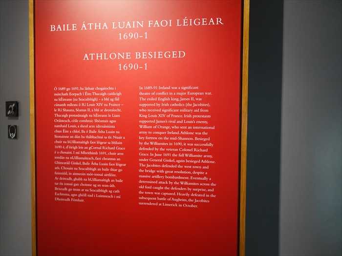ATHLONE BESIEGED1 6 9 0ー1ATHLONE BESIEGED1 6 9 0ー1ln 1689ー91 lreland was a sigmficant theatre of conflict in a major European war.The exiled English king,JamesⅡ, wassupported by lrish catholics (the Jacobites),who received significant military aid from King Louis XIV of France. lrish protestantssupported James's rival and Louis's enemy,William of Orange, who sent an internationalarmy to conquer lreland. Athlone was the key fortress on the mid-Shannon. Besiegedby the Williamites in 1690 , it was successfully defended by the veteran Colonel RichardGrace.In June 1691 the full Williamites army,under GeneraI Ginkel, again besieged AthIone.The Jacobites defended the west town and the bridge with great resolution, despite amassive artillery bombardment. Eventually a determined attack by the Williamites acrossthe old ford caught the defenders by suprise,and the town was captured.Heavily defeatedin the subsewuent battle of Aughrim,the Jacobites surrendered at Limerick in October.【包囲されたアスローン(1690~1691年)1689年から1691年にかけて、アイルランドはヨーロッパ全体を巻き込んだ大規模な戦争の中で、重要な戦場となっていました。イングランドから追放された王、ジェームズ2世は、アイルランドのカトリック教徒(ジャコバイト派)の支持を受け、さらにフランス王ルイ14世から大きな軍事支援を受けていました。一方、アイルランドのプロテスタントたちは、ジェームズの対抗者であり、ルイ14世の敵でもあった**オレンジ公ウィリアム(ウィリアム3世)**を支持しており、彼はアイルランドを征服するために多国籍軍を派遣しました。アスローンは、シャノン川中流に位置する戦略上の要塞都市として、極めて重要な地点でした。1690年、アスローンはウィリアム派(ウィリアマイト軍)に包囲されましたが、老練な指揮官リチャード・グレース大佐のもとで防衛に成功しました。翌年の1691年6月、ウィリアマイト軍はギンケル将軍の指揮のもと、再びアスローンを本格的に包囲しました。ジャコバイト側は町の西地区と橋を砲撃の嵐の中で懸命に守りましたが、最終的にウィリアマイト軍が古い浅瀬を通って奇襲攻撃を行い、防衛軍を不意を突いて町を攻略しました。その後のアウクリムの戦いでジャコバイト軍は大敗を喫し、10月にリムリックで降伏しました。】ギャラリー3は「アスローン包囲」というテーマで、1690年と1691年のアスローン包囲に至るまでの出来事を紹介している。ギャラリーは、戦闘中の軍隊を360度のビクターアンブラスのスケッチが描かれている。3人の登場人物の音声によって当時のアスローンでの生活を紹介しているのであった。THE WAR OF THE KINGSThe unpopular English king, the catholic JamesⅡ,was overthrown by his DutCh son-in-law,William of Orange,in the 'Glorious Revolution' of 1668.This was a setback for King Louis XIV of France,Europe's most powerful ruler, for Jarnes was his ally,whereas、William was his most inveterate enemy and a key figure ln European—wide anti—French alliance.A major European war soon broke out. lrish catholics laised a large army no support James,hoping a victory for him would reverse their losses of wealth and power.Louis seized the opportunity to undermine William.His navy was strong,and sent James toIreland with French officers and substantial military supplies.Irish protestants backed William to use Ulster as a bridgehead for the build-up of a largemulti-national army.In 1690 he came to Ireland to take personal command of his forcesfor the campaign against James.【王たちの戦争不人気だったイングランド王、カトリックのジェームズ2世は、**オランダ人の娘婿ウィリアム・オブ・オレンジ(ウィリアム3世)**によって、**1688年の「名誉革命(Glorious Revolution)」**で王位を追われました。この出来事は、ヨーロッパで最も強大な君主であったフランス王ルイ14世にとって痛手でした。なぜなら、ジェームズは彼の同盟者であり、ウィリアムは彼の宿敵であり、ヨーロッパ規模での反フランス同盟の中心的人物だったからです。その後まもなくして、ヨーロッパ全土を巻き込む大戦争が勃発しました。アイルランドのカトリック教徒たちは、ジェームズを支援するために大規模な軍隊を結成しました。彼らは、ジェームズの勝利によって、自らが失った財産や権力を取り戻せることを望んでいたのです。ルイ14世はこの機会を利用して、ウィリアムを弱体化させようとしました。強力なフランス海軍の支援のもと、彼はジェームズをアイルランドへ送り込み、フランス人将校や大量の軍事物資を提供しました。一方、アイルランドのプロテスタントたちはウィリアムを支持し、アルスター地方を橋頭堡として、多国籍軍の集結を進めました。1690年、ウィリアムは自らアイルランドに上陸し、ジェームズに対する軍事遠征を直接指揮するために現地入りしました。】BATTLE OF THE BOYNEIn 1690 William's 35,000-strong army of British,Dutch,Danes,Huguenots and Irish protestants took the offensive south and on 1 Jury defeated James's 24,000-strong Jacobite army at the battle of the Boyne.This gave William Dublin and the east of Ireland.James returned to Flance.However,theJacobite army made good its escape and regrouped at Limerick.William made no offer of reasonable peace terms.Patrick Sarsfield and the other Irish army leaders determinedto continue the war.The line of th