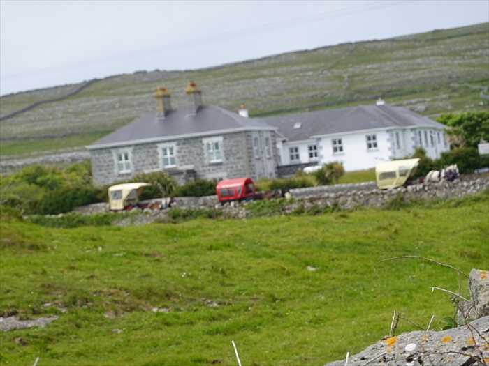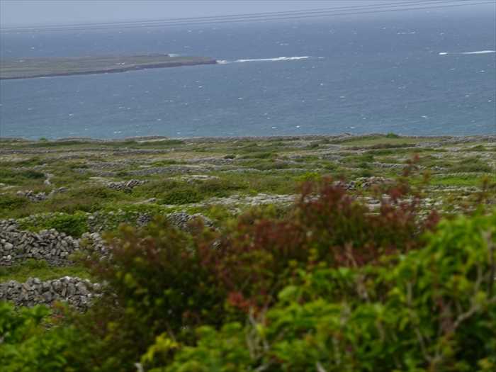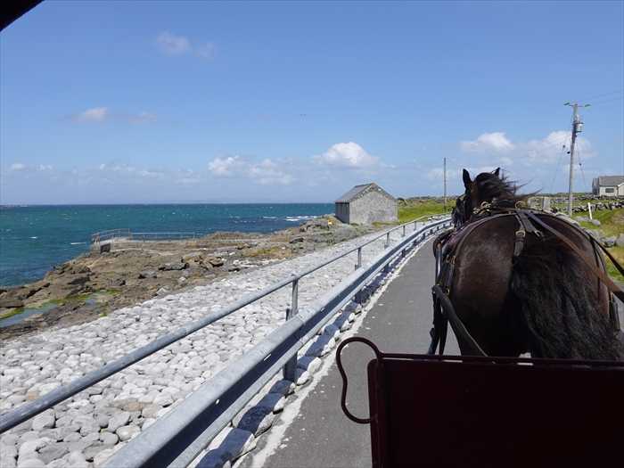 Kilmurvey Beachの沖が眼前に。沖にはLettermullan・レターマラン方向の陸地が微かに見えた。ズームして。再びKilmurvey Beach方向を。白壁の民家の先がKilmurvey Beach。Teampall an Ceathrar Álainn (The Church of the Four Beauties)。「四人の聖者の教会」と。ズームして。両端に三角の切妻壁(gables)がある屋根は失われているが、壁面は良好に残存し周囲は低い石垣に囲まれていた。伝承によると、この地に埋葬された4人の聖人、または美徳ある兄弟を指すと。 「四人の美しき者」伝説がると。この教会の最大の魅力は、名前の由来となった「四人の美しき聖人たち(Ceathrar Álainn)」に関する伝承。伝説によれば、4人の兄弟がこの地に住んでおり、彼らは敬虔で、知恵に富み、心身ともに優れた人物だったと。彼らは世俗から離れてこの地に修道的な生活を営み、やがて殉教したとも、自然の死を遂げたとも言われていると。死後にこの場所に埋葬され、奇跡が起きたという言い伝えがある。地元の人々は彼らを「四人の美徳者(the four virtues)」として崇敬し、この教会を巡礼の地としたのだと。右急カーブにさしかかる。泉が現れた。近づいて。Tobar an Cheathrair Álainn(四聖人の井戸)と。この井戸も教会と同様、四人の聖人(伝説的な兄弟)に捧げられたとされており、治癒の力がある聖水として地元の人々に崇められて来た と。岩壁の下に。この泉の水は奇跡の癒しの力があるとされており、古来から多くの巡礼者が訪れてきた。特に「目の病気」や「皮膚疾患」に効くとされており、信仰を持って水をすくい、顔や患部を洗う人がいるのだと。泉の中に小さな奉納品(十字架、石、布など)を置く習慣もある と。見下ろして。アイルランドの多くの聖井戸と同様に、ここでも「巡礼の道行(Turas)」が行われのだと。・聖井戸の前で祈るまたは周りを時計回りに3回歩きながら祈りを捧げる。・石を積んだり、聖水を持ち帰ったりする。・井戸の水を飲んだり、手足を浸したりすることで「四人の聖人」から加護が得られると 信じられていた。古代からこの島の大切な場所。風雪に耐えて。共学校・Coláiste Ó Direáinコライステ・オ・ディレインは、アイルランドの若者に楽しくアクティブな方法でアイルランド語を教えることを目的として、1984年に設立されたゴールウェイ州にあるアイルランド語サマーカレッジです。ゴールウェイ州アラン諸島の美しいイニス・モア島で、専門的に運営される3週間のコースを夏季に提供しています。移動して。「Teampall an Cheathrar Álainn(四聖人の教会)」跡の近くに立つ「キリスト磔刑像」。十字架に架けられたイエスの姿を表現していた。Teampall an Cheathrar Álainn(四聖人の教会)とTobar an Cheathrar Álainn(四聖人の井戸)とともに、一体となった聖地巡礼の場を構成していたのであった。正面から。坂道を下る。左奥に断崖・Port Bhéal an Dúinが見えた。ズームして。Kilmurvey Beachに向かってさらに下る。青いKilmurvey Beachの姿。断崖方向を。それにしても、野菜栽培等畑になっている場所がないのであった。アラン諸島はアイルランドで最も不毛の地域として残されたところで,過去には森林が茂り,土地生産力も高かったと想像されるが,木がなくなったことは,降水量の保持に欠け,強い風と石灰岩の風化を進めさせたに違いない。その結果畑の開墾において他地域とは異なる方法にたよらざるを得ないであろう。アランでは適当な平らにちかい場所を先ず選ぶのであろう。その上の土壌は薄くて手で携むことができない程薄い。風で吹き飛んでってしまったからであろう。畑とするには,地表面ならぬ石灰岩の表面から大きな石を取り除き,あるものは砕いて平坦に近くなるようにし大きな割れ目には小石をつめて,風よけと家畜の柵のかわりによけた石を境に積みあげる。次に海岸から海草を運ぶ,さらにその上に良い上を選んで運び覆う(客土する)。すると断面は基盤は石灰岩,その上に海草,砂,海草,土という順になる。この様な客土を容易に入手出来ない土地の状況、海岸線が近いことからの塩害等で、葉物野菜の栽培は厳しいのであろう。何とか馬鈴薯の栽培が辛うじて行えるようであった。よって、キャベツ、レタス、玉ねぎ等は自宅の周りの狭い場所で、辛うじて自宅用にのみ、栽培されているようであった。前方にCemetery・墓地。Old celtic cemetery with crosses・古代ケルトの十字架墓地。Kilmurvey Beachからの上り坂を自転車で上る集団が我々の馬車を追う。私のカメラに手を振って。石積みの塀の下で犬も迎えてくれた。 ・・・もどる・・・ ・・・つづく・・・