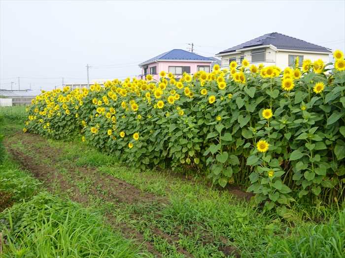 昨日の我が家の前のヒマワリ・向日葵畑です。あっという間に満開になりました。和名「向日葵」の由来は、太陽の動きにつれてその方向を追うように花が回るといわれたことから。ただしこの動きは生長に伴うものであるため、実際に太陽を追って動くのは生長が盛んな若い時期だけである。若いヒマワリの茎の上部の葉は太陽に正対になるように動き、朝には東を向いていたのが夕方には西を向く。日没後はまもなく起きあがり、夜明け前にはふたたび東に向く。この運動はつぼみを付ける頃まで続くが、つぼみが大きくなり花が開く頃には生長が止まるため動かなくなる。その過程で日中の西への動きがだんだん小さくなるにもかかわらず夜間に東へ戻る動きは変わらないため、完全に開いた花は基本的に東を向いたままほとんど動かない のだ。太陽に向かって咲く姿が、生命力と希望を象徴していると感じるのだ。見る人を元気にする明るさとエネルギーがある花。群れ咲くひまわり畑は、まるで黄色い海のように壮観そのもの。大輪で堂々とした花姿が、ひときわ目を引く存在感を放っているのだ。この日は青空ではなかったが、青空とのコントラストが見事で、夏の風景を絵画のように彩るのだ。日本人がひまわりを好きな理由は?明るく前向きなイメージが日本人の心に響くから → まっすぐ太陽を向いて咲く姿が「希望」「元気」「前向きさ」を連想させる。東日本大震災の被災地などで「復興の象徴」とされたこともあるから → 福島などで放射能を吸収する植物として植えられたり、祈りの花としての意味も強まった。「ひまわり=笑顔」というイメージが文化に根付いているから→ 花の姿が笑顔に似ているという連想から、心が和む存在として親しまれている。大輪で華やかだが、気取りがなく素朴さがあるから→ 美しさと親しみやすさのバランスが、日本人の「控えめな美意識」に合っている!?映画やドラマ、ポスターなどで感動の象徴として描かれてきたから → 映画『ひまわり』(1970年)などの印象的な作品で、切なさや愛の象徴としての イメージも加わった!?。 →大谷翔平がホームランを打つと、ベンチ前でチームメートがひまわりの種を、 “ひまわりの種”シャワーとして顔面に!!2列のひまわり畑。こちらは、北東方向を向いて。ところどころに、他所見をしている花の姿も。そして我がミツバチ!??も訪花中。ズームして。上手く撮れました。・ひまわりも日陰が好きと訴える・ひまわりに目鼻をつけてみたくなる・ウクライナ散るひまわりに思い馳せ ・・・・詠み人知らず・・・・ ・・・おわり・・・