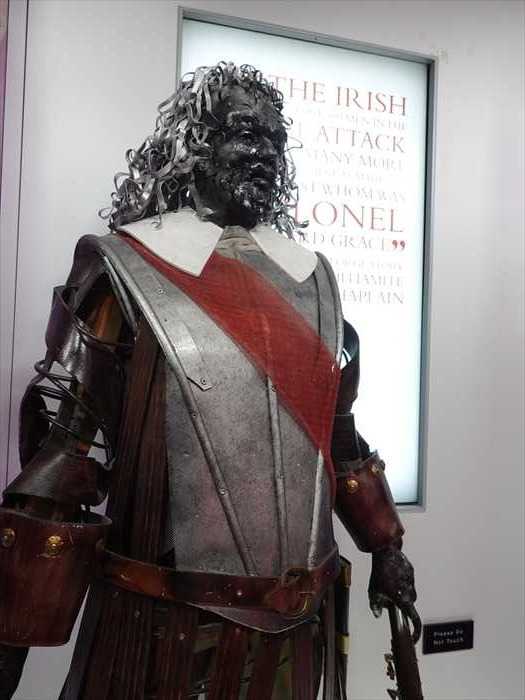 ギャラリー5は「包囲の人々」というテーマで、写真のようにアスローンの包囲戦に巻き込まれた17世紀の代表的な人物を彫刻で展示している。攻撃と防御を主導した軍の将軍を含む8人の主要なキャラクターの等身大の彫刻で表現しているのであった。COLONEL RICHARD GRACE近づいて。「COLONEL RICHARD GRACEColonel Richard Grace (c. 1612–1691) was an Irish Royalist soldier who fought for Charles I, Charles II and James II. He served in the Royalist Army in Exile during the 1650s.【リチャード・グレース大佐(約1612年 – 1691年)リチャード・グレース大佐は、アイルランド出身の王党派(ロイヤリスト)の軍人であり、チャールズ1世、チャールズ2世、そしてジェームズ2世のために戦いました。1650年代には、亡命中の王党派軍(Royalist Army in Exile)に所属していました。】「COLONEL GUSTAVUS HAMILTON」 「COLONEL GUSTAVUS HAMILTONColonel Gustavus HamiIton (1642-1723 ) ,an lrish protestant丘0n1 County Leitrim,wasa professional soldier. He served on the Continent and afterwards in the lrish army.ln 1689 he joined the Williamites and took pairt in the early, unsuccessful defence of Ulster against the Jacobites. Retiring tO England he was given command and of a newregiment,which he successfully led in the lrish campaign in 1690ー1. He participated in the major engagements atthe Boyne, Limerick and Aughrim. His most famous exploit was to lead the grenadiers that spearheaded the brave and successful attack across theriver at Athlone. He subsequently rose to the rank of major general and was made governor of AthIone. He acquired a large estate in County Meath, became a member 0fparliament and eventually peer, with the title Viscount Boyne.【グスタヴァス・ハミルトン大佐(1642–1723)アイルランド・リートリム県出身のプロテスタントで、職業軍人でした。彼は大陸ヨーロッパで軍務に就いた後、アイルランド軍に所属します。1689年、彼はウィリアマイト側(ウィリアム3世支持派)に参加し、ジャコバイトに対するアルスター地方の防衛戦に加わりますが、これは失敗に終わりました。その後、一時的にイングランドに退却しますが、新たな連隊の指揮官に任命され、1690〜1691年のアイルランド戦役でその指揮を成功裏に果たしました。彼は以下の主要戦闘に参加しました:・ボイン川の戦い(1690)・リムリック包囲戦・アウクリムの戦い(1691)彼の最も有名な功績は、アスローンでのシャノン川渡河作戦において擲弾兵(グレナディア)を率い、決死の突撃を成功させたことです。この後、彼は少将(メジャー・ジェネラル)に昇進し、アスローンの総督に任命されました。さらにミース県に広大な土地を所有し、国会議員となり、最終的には「ボイン子爵(ヴィスカウント・ボイン)」の爵位を授かりました。】「JEAN DE BONNAC MARQUIS D'USSON」「JEAN DE BONNAC MARQUIS D'USSONJean Louis d'Usson, Marquis de Bonnac (1672-1738) was French Ambassador to theOttoman Empire from 1716 until 1724.[1] One of his main missions was to assure that the Ottoman Empire remained a threat to the Habsburgs, the main rival of Francein Europe, a regular objective of the Franco-Ottoman alliance. He wrote Mémoire historique sur l'Ambassade de France à Constantinople.From 1690 to 1694 he was a musketeer. In 1694 he was captain of a dragoons company. In 1696 he entered the diplomatic service and served as secretary to his uncle fr:François d'Usson de Bonrepaus in Denmark. In 1698 he replaced uncle François d'Usson deBonrepaus as Chargé d'affaires in The Hague. In 1700 he was envoy extraordinary to the Principality of Brunswick-Wolfenbüttel, were in 1701 he was replaced by uncle Françoisd'Usson de Bonrepaus and went to the Court of Stockholm. From 1707 to 1710he was representative at the court of Stanisław Leszczyński. In May 1711 he replaced Jean-Denis de Blécourt at El Escorial where he was till 1713 as envoy extraordinary」 【ジャン・ルイ・デュッソン、ユッソン侯爵(Marquis de Bonnac)は、1716年から1724年までフランスのオスマン帝国駐在大使を務めました。彼の主な使命の一つは、オスマン帝国がフランスの欧州における宿敵ハプスブルク家に対して脅威であり続けるよう努めることでした。これはフランス=オスマン同盟の基本的な戦略目標の一つでした。彼はその経験をまとめて、『コンスタンティノープルにおけるフランス大使館の歴史的回顧録(Mémoire historique sur l'Ambassade de France à Constantinople)』を著しました。】「ジェントルマンの眠る像(Resting Gentleman)」。・青とオレンジの鮮やかな服装:17世紀のヨーロッパ貴族の軍装風で、カロリング様式の影響を 感じさせます。・カツラと羽付き帽子:当時の上流階級の象徴。・手を胸に置き、横たわる姿勢:死者の像や戦没者の追悼像に共通するポーズ。・背後の映像:遺体または埋葬された兵士の映像が表示され、歴史的戦争のリアリティと 記憶の継承を意図している。?????当時の軍事命令書、戦争記録、または犠牲者名簿のモニュメント的なレプリカ?「AFTERMATH OF THE SIEGE AND REBUILDING」 【包囲戦の余波と再建】「AFTERMATH OF THE SIEGE AND REBUILDINGAfter the siege Athlone became a Williamite fortress.Before marching west, Ginkel had the dead of both sides buried and ordered the streets of the west town to be cleared of rubble.So many houses had been demolished in the bombardment that the Williamite garrison had to be accommodated in tents, although wood