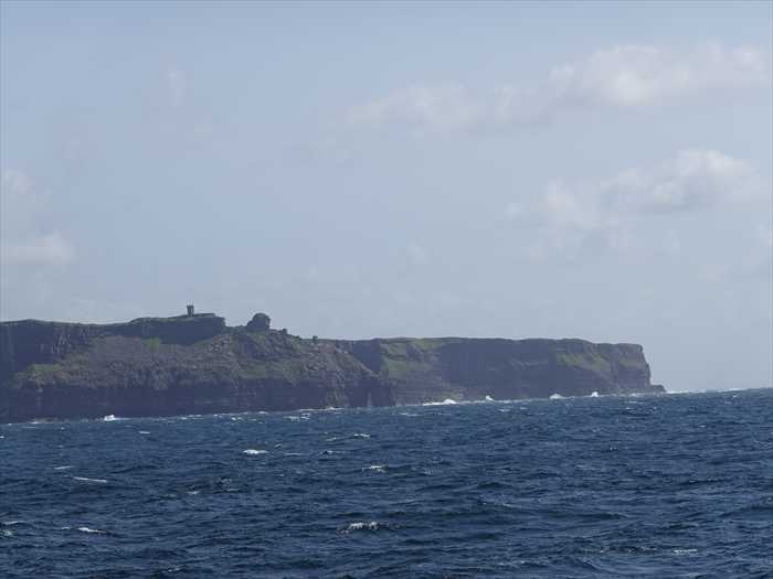 定刻の15:30に帰路の観光フエリーは桟橋を離れた。写真は、座席から窓越しに撮影している為、茶色っぽくなってしまった。窓ガラスの種類によっては、特定の色の光を吸収したり反射したりするため、写真の色味に影響を与えることがあるのだろう。赤線---が帰路の観光フェリーの就航ルート。帰路には、大西洋からそびえ立つ高さ約200mもの断崖絶壁が8kmにわたって連なる「破滅の崖」の意味を持つ「モハーの断崖(愛: Aillte an Mhothair、英: The Cliffs of Moher」を見る為に船を近づけてくれたのであった。Inishmore島のコミュニティ センター「Halla Ronain」の先に史跡「Inishmore lighthouse」、「Dún Eochla」が丘の上に見えた。 アラン諸島最大の島中央、ドゥン・アーラン(Dún Árann)信号塔に隣接する、1818年築の旧灯台。通称 Inishmore Lighthouseまたは Dún Árann Lighthouseと呼ばれ、1857年に廃灯となった と。史跡「Inishmore lighthouse」をネットから。史跡「The Seven Churches」。 ネットから。丘の上の民家。Inishmore島東端の半島が見えて来た。Inishmore島東端の半島の先の小さな島には灯台があった。Straw Island Lighthouse・ストロー島灯台ストロー島灯台は、アイルランド、ゴールウェイ州イニシュモア島の北東、キリアニー湾にあるストロー島(Straw Island、アイルランド語:Oileán an Tuí )で、航行の補助灯として機能している。1878年に完成したこの灯台は、19世紀にアラン諸島に建設された4つの灯台のうち最後のもの。ストロー島の就役は、キリアニー湾とキルロナン港への安全な航行のために灯台を建設しようと、地元島民が24年にわたる長いキャンペーンを展開してきた成果であった と。下記写真はネットから。Inishmaan島の西側の断崖を見る。岩場にぶつかり巨大な白波に。イニシュマーン島の民家。アラン諸島の史跡の中で最も有名な、Dún Aonghasa・ドゥン・アオンガサ。壮観なイニス・モアの端、高さ100メートルの断崖。ズームして。これも小型観光船か。イニシュマーン島の北端を見る。ズームして。アラン諸島の最東端・一番小さな島、Inisheer・イニッシアー島の史跡「O'Briens Castle」その右に「An Tur Faire (Tower Ruin)」 「O'Briens Castle」をネットから。O'Briens Castle(オブライエンズ・キャッスル)は、アイルランドのアラン諸島のイニシュモア島(Inis Oírr / Inisheer)に位置する中世の城の遺跡。かつてこの地域を支配した強力な一族、オブライエン家(O'Brien clan)によって建てられた。オブライエン城は島で最も高い地点の一つ、イニシア島の北に位置。これらもネットから。「O'Briens Castle」の右側に見えたのが「An Tur Faire (19 世紀の塔)、Tower Ruin)」 アラン諸島イニスヒア島(Inis Oírr/Inisheer)の丘の上にある、ナポレオン戦争期の見張り塔跡。建設時期:1806〜1808年頃、ナポレオン軍の侵攻に備えてイギリス政府が沿岸に設置した 信号塔のひとつ。通信方法:旗や形状物を使用した視覚的信号交換で、他島や本土と連携し早期警戒を目的とした 。廃止時期:ナポレオン敗北後の1814年以降、維持されず放置され、現在では遺構として残るのみ 。ネットから。こちらは附属の建物(ネットから)だったのであろうか?Inisheer・イニッシアー島の北側の斜面には多くの住宅が。現在の住宅と19世紀の史跡のコラボ。Inisheer・イニッシアー島の北側にはイニッシアー・エアポートがある と。Inis Oirr (Inisheer) Lighthouse・イニシィア島の灯台をズームして。ネットから。海上灯台・航路標識か?そして遠くに見えてきたのが「Cliffs Of Moher(モハーの断崖)」。 モハーの断崖はアイルランドのクレア県ドゥーリンに近いバレン南西端のリスカナーに位置する。 大西洋から聳え立つ崖の高さはハグ岬で120m、8km離れた最高地点オブライアン塔の真北で214mに達する。アイルランド中でも壮観な眺望を誇り、晴れた日にはゴールウェイ湾に浮かぶアラン諸島やコネマラの谷や丘が見られる。「Hag's Head」が前方に。その後ろに「Moher Fort Site Telegraph Station」 「Hag's Head(ハグズ・ヘッド)」の意味は、直訳すると、「老婆の頭(魔女の頭」と。 「Hag's Head・ハグズ・ヘッド」は、アイルランド、クレア州にあるモハーの断崖の最南端に付けられた名前。この地の断崖は、海を見つめる女性の頭のような珍しい岩層を形成していると。ここからは、断崖の大部分を見渡す絶好のロケーションであると。「Hag's Head・ハグズ・ヘッド」にまつわる有名な伝説「MAL(マル)の物語」があると。それは「マール(Mal)」という名の老婆と、アイルランドの英雄「クー・フーリン(Cú Chulainn)」にまつわる話。あらすじ:老女マール(Mal)は、アイルランドの英雄・伝説の戦士クー・フーリンに恋をします。クー・フーリンはその愛に応えることなく、崖づたいに彼女を逃れます。マールは彼を執拗に追って、崖の上を飛び移るようにしてついて行きます。最後にマールは、ジャンプに失敗して崖から転落し、海に沈んでしまいました。その転落した場所が、「Hag’s Head」と呼ばれるようになったと。ネットから。陸地側からの写真もネットから。「Moher 