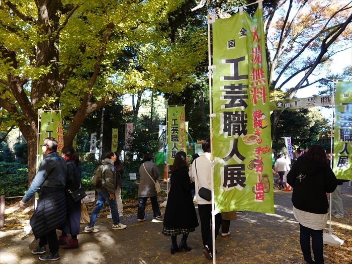「全国工芸職人展」を訪ねた。「全国工芸職人展」(旧・森のやきものフェア)は毎年、いちょうが「黄葉(こうよう)」する季節に行われる物産フェア。多彩な工芸品が展示販売されていた。毎年11月中旬から12月上旬まで、青山通りから聖徳記念絵画館に向かって約300メートル続く」146本のいちょう並木が黄金色に染まる。落ち葉で埋め尽くされた並木道はまさに黄金色の「いちょうのトンネル」。このいちょう並木と聖徳記念絵画館の間の広場に特産品の販売店や飲食店が出店しているのであった。明治神宮外苑 いちょう並木の右奥に入口があった。「2024年 第11回 全国工芸職人展」日時:11月21日(木)~12月8日(日) 10:00~17:00会場:【明治神宮外苑】イチョウ並木隣接の権田原会場入場料:無料会場案内図。近づいて。キッチンカー、テントが並ぶ。養老乃瀧グループ。「ふくしま糀味ラーメン」。さらに進む。盆栽。まゆ工芸。さかたや・石焼き芋。五平餅。狭山茶。さらに奥へ鮎塩焼。大道芸。奥にあったのが「御観兵榎について」案内板。「御観兵榎についてこの外苑の敷地は、もと陸軍の青山練兵場で、明治天皇の御台臨のもとにしばしば観兵式が行われ、なかでも明治二十三年(一八九〇)二月十一日の憲法発布観兵式や、明治三十九年(一九〇六)四月三十日の日露戦役凱旋観兵式などは、特に盛大でありました。聖徳記念絵画館の壁画「凱旋観兵式」(小林万吾画)にその時の様子が描かれており、当時の盛儀が偲ばれます。明治天皇がご観兵される時は、いつもこの榎の西前方に御座所が設けられたので、この榎 を「御観兵榎」と命名し永く保存しておりましたが、平成七年(一九九五)九月十七日老令(樹令二百余年)の為台風十二号余波の強風により倒木しました。遺木の一部は聖徳記念絵画館内に名木「ひとつばたご」の遺木と共に保存されております。平成八年(一九九六)一月、初代御観兵榎の自然実生木(推定樹令六十年)を苑内より移植し、「二代目御観兵榎」として植え継ぎました。 平成八年一月吉日 明治神宮外苑「初代 御観兵榎」榎 にれ科えのき属、樹齢二百余年と推定される。幹廻り、二・二メートル 高さ、 九メートル 枝張り、十六メートル碑石 石材は伊豫(愛媛県)青石、天然石題字 東郷平八郎 書 明治三十八年日本海海戦においてロシアバルチック艦隊を壊滅させた、 当時の連合艦隊司令長官 東郷神社の祭神前方左に「御観兵榎」碑。「御観兵榎 伯爵東郷平八郎書明治天皇には明治二十年青山練兵所設置以来恒例の觀兵式又は憲法發布及び凱旋観兵式に親臨あらせ・・し節に此の榎の下 御馬を駐めさせ・・・大正十五年七月明治神宮奉賛會」黄葉と紅葉のコラボ。近づいて。オカリナ 生演奏中。オカリナ製作&演奏 白井進👈️リンク水引で造ったかんざし類。大道芸 バルーン(風船芸)。草木染め山口・伝統工芸品、着物、帯。そして出口に向かう。出口。再び、明治神宮外苑 いちょう並木をカメラに。和服姿で記念撮影するカップル。お顔から外国人のようであったが。 ・・・もどる・・・ ・・・つづく・・・