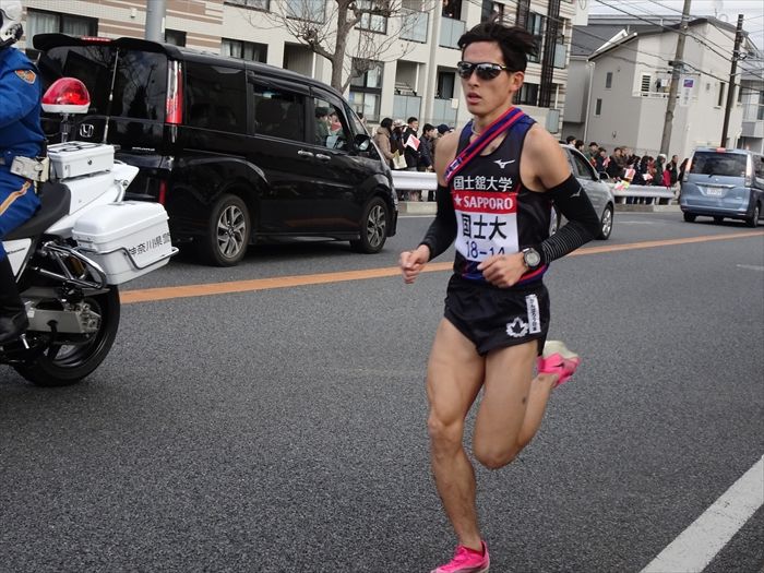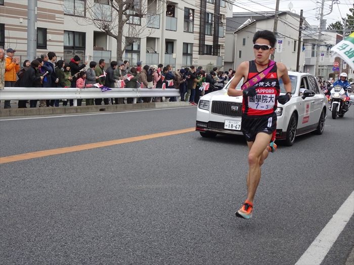 序盤から飛ばした。1分28秒差の3位でたすきを受けた国学院大の浦野雄平(4年、富山商)は