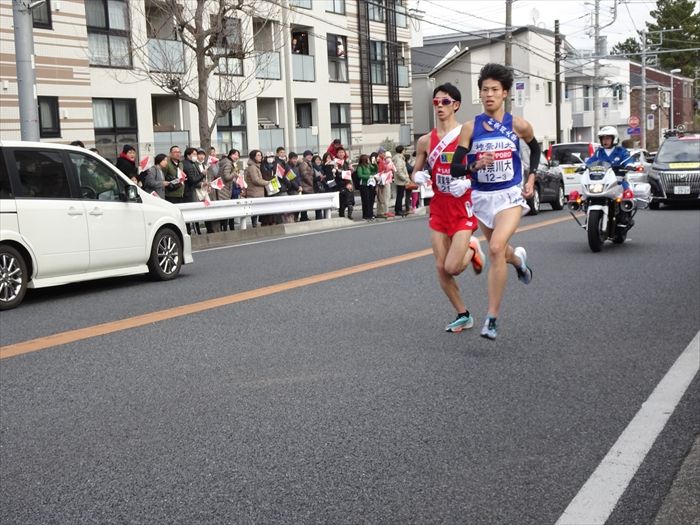 宮ノ下の9.3km地点で青学大と国学院大は1分22秒差。3位は東海大で先頭と2分16秒差。