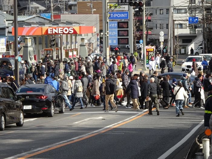 応援を終了し、藤沢橋の横断歩道を渡る人々の姿。