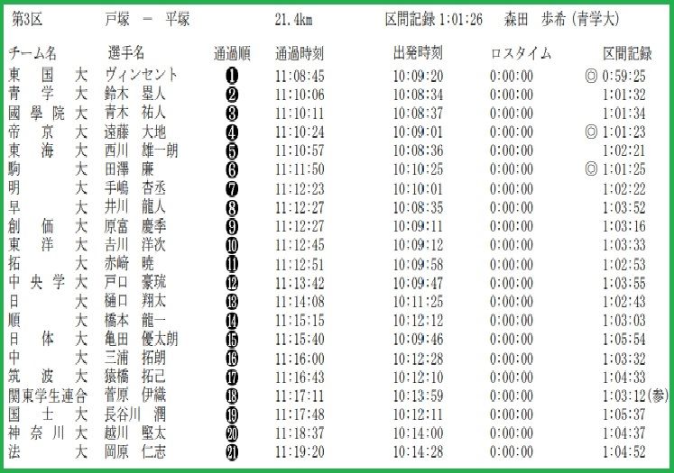 トップ通過は東京国際大学、1分21秒遅れで青山学院、そして更に5秒遅れで國學院大學が