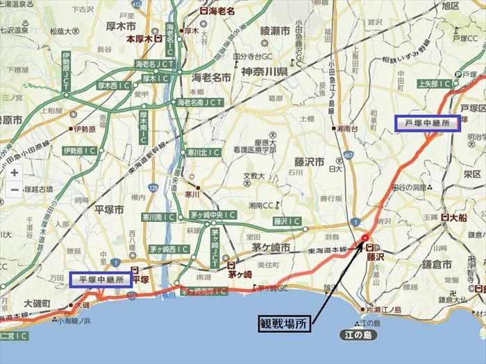 この場所は、箱根駅伝第3区:戸塚~平塚(21.4km)の戸塚中継所から約6kmの場所。