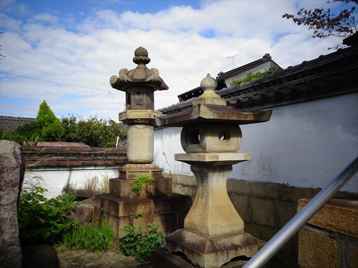 門前の、文化8年(1811)の常夜燈(奥)と安永4年(1775)の常夜燈(手前)。