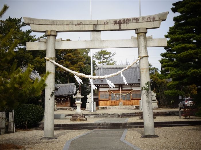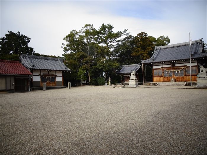 南側からの道路が神社正面で左右に分かれるY字路になっていて左側は三河八橋駅、