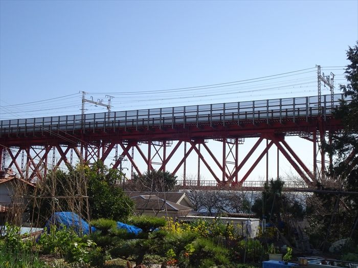 海岸線に近く、赤く塗装されたこの橋は、いわゆる鉄橋のイメージを