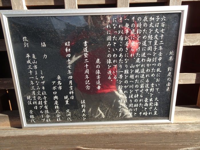 鹿が現れたので神の助けとその鹿に乗られ、山を超へ川を渡り関の里へ無事お着きになり