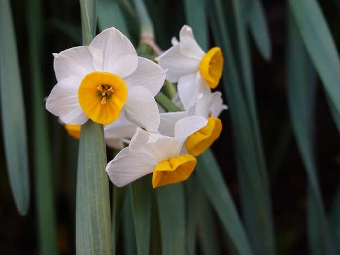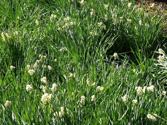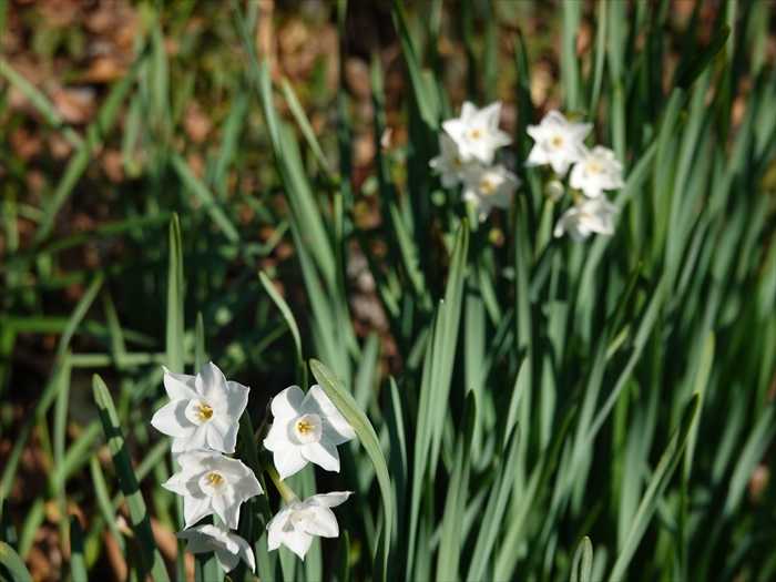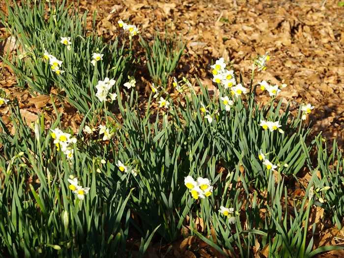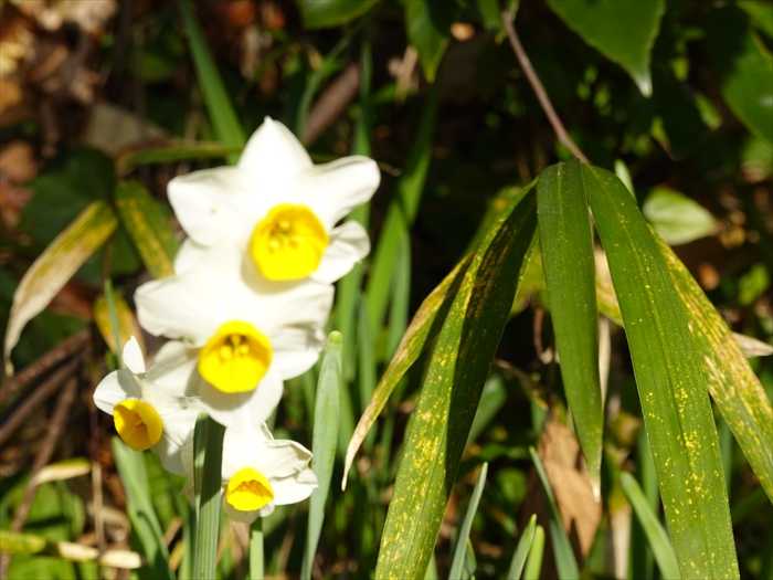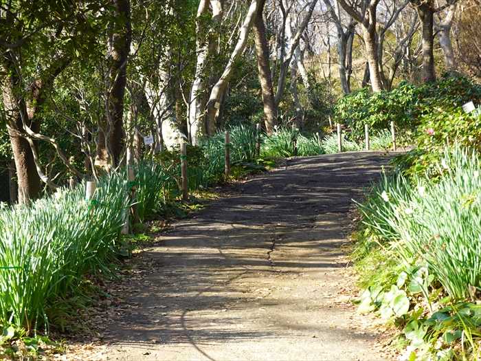 石段を登り終わると、坂道に変わり両側には様々な種類のスイセンの花が咲いていた。