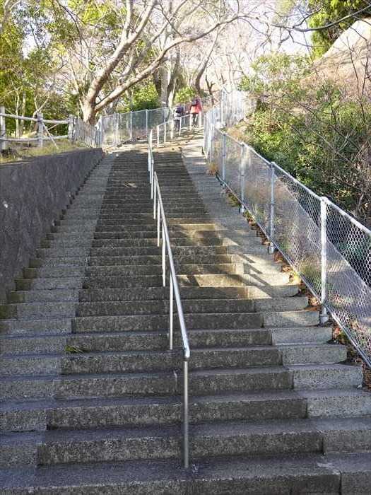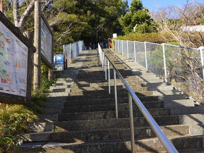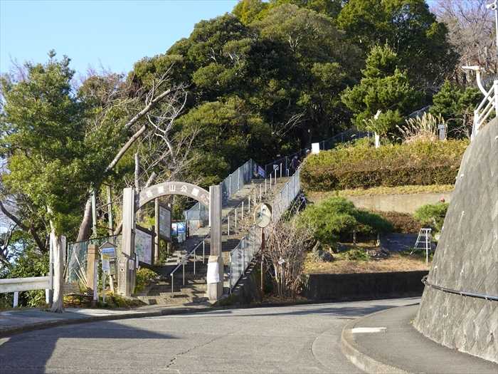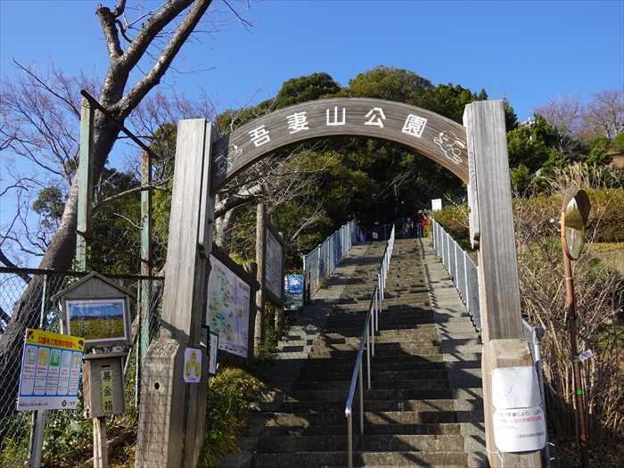 「吾妻山公園」と書かれた木製のアーチの先にはいきなり急な石段が