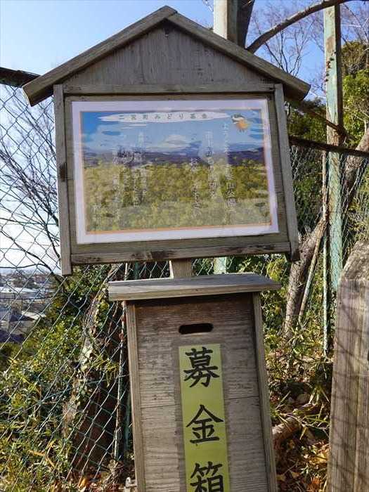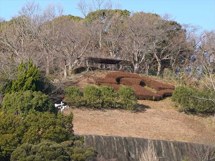 JR二宮駅ホームからの吾妻山第2展望台・休憩所下の植栽で形どった二宮町の町章を見る。