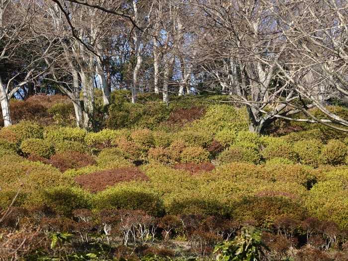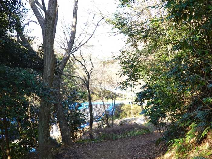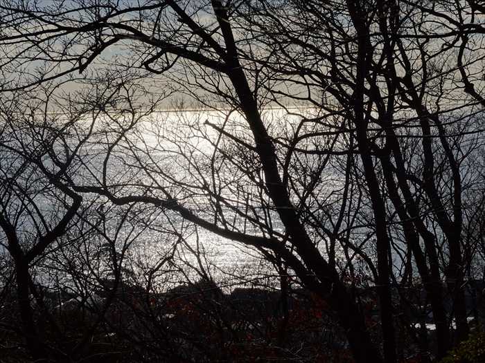 葉を落とした樹々の先には光る海・相模湾の姿が。