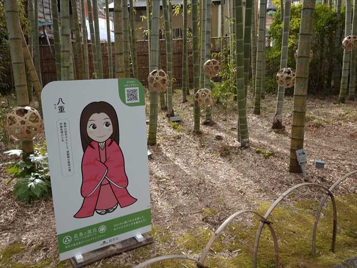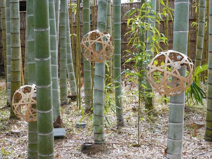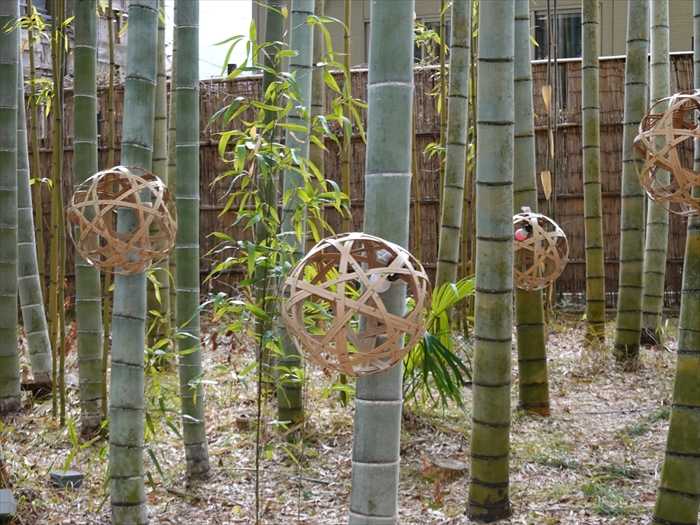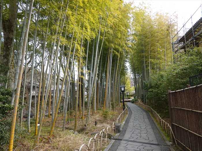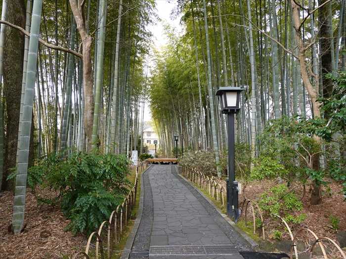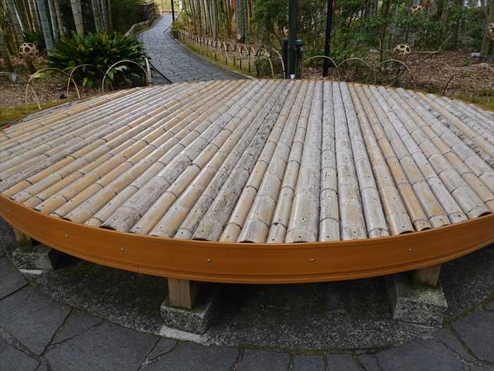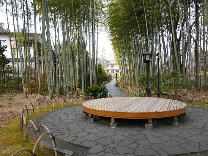 竹林の小径を歩くと、茶処や火の見櫓が懐かしく、竹林中央にある大きな竹の円形ベンチに