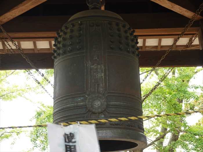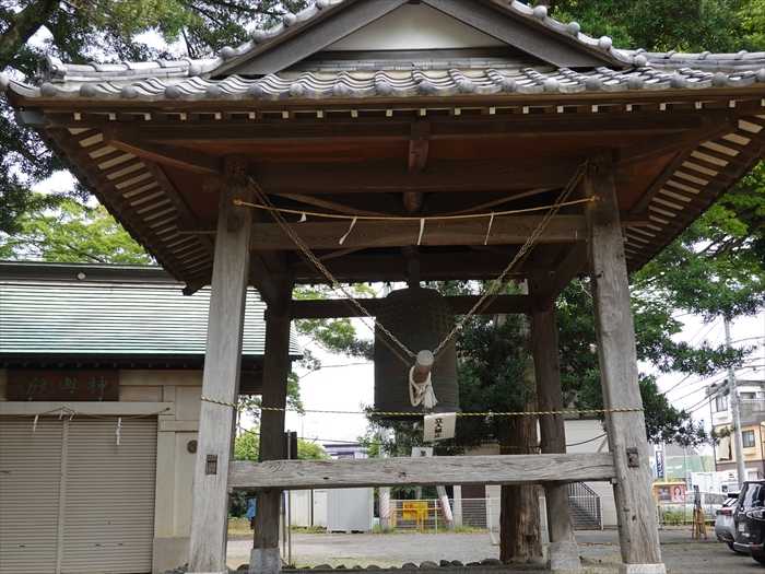 境内の左奥から拝殿、鐘楼を見る。
