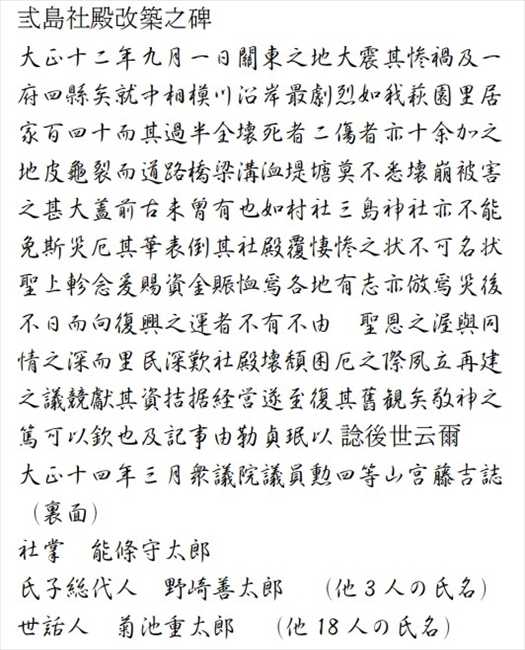 「弎(三)島社殿改築㞢(之)碑」