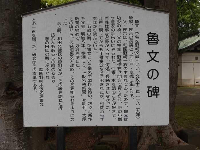 『西洋道中膝栗毛』『安愚楽鍋』などで有名な明治初期の戯作者、仮名垣魯文の記念碑。