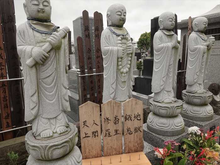 六地蔵の前には「地獄 餓鬼 畜生 修羅 人間 天上」と「六道」の文字が。