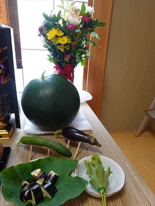 併せて、この場所に、キュウリとナスで造った精霊馬(しょうりょううま)を置きます。