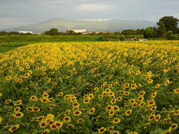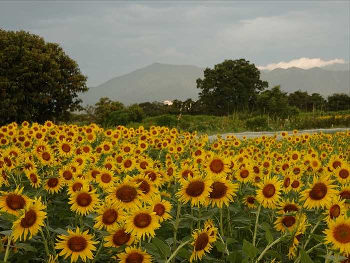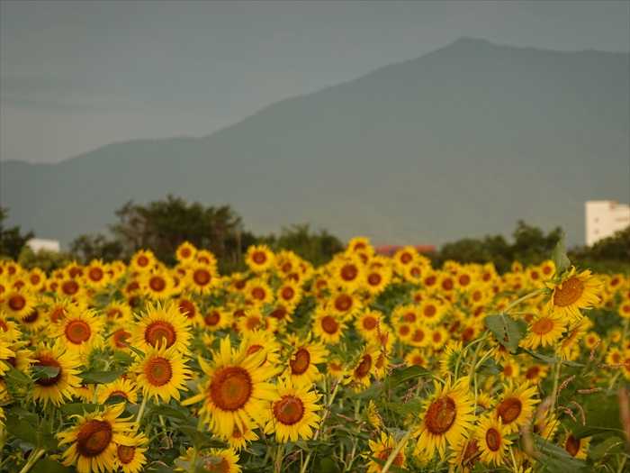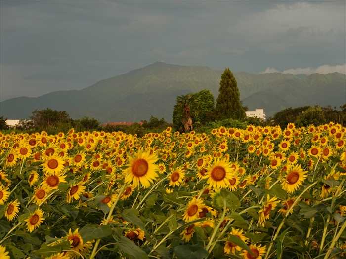 大山を背景に『四ツ谷エリア』のひまわり畑を。