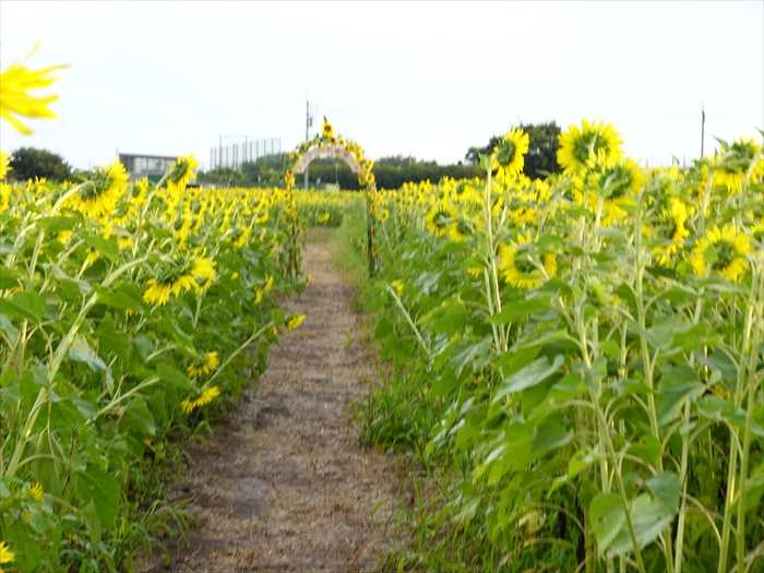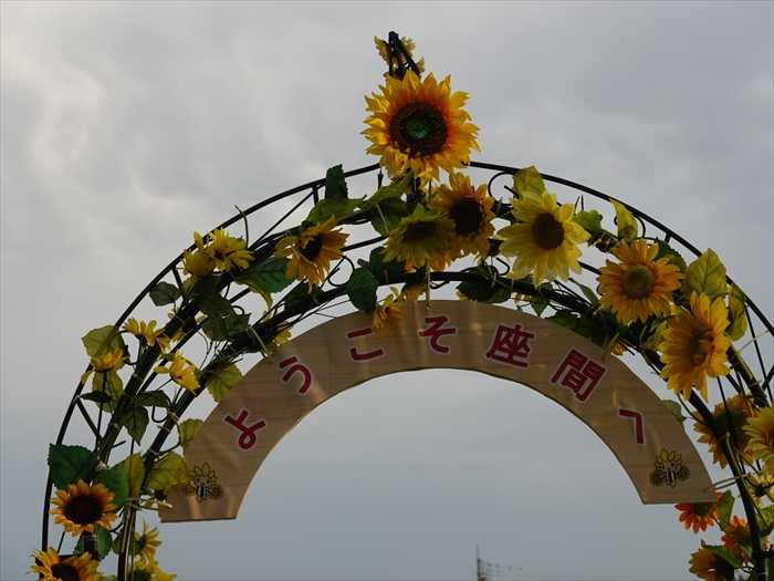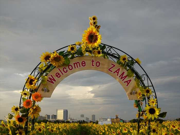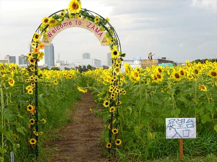 ひまわり畑内への散策通路の入口アーチには「Welcome to  ZAMA」と。