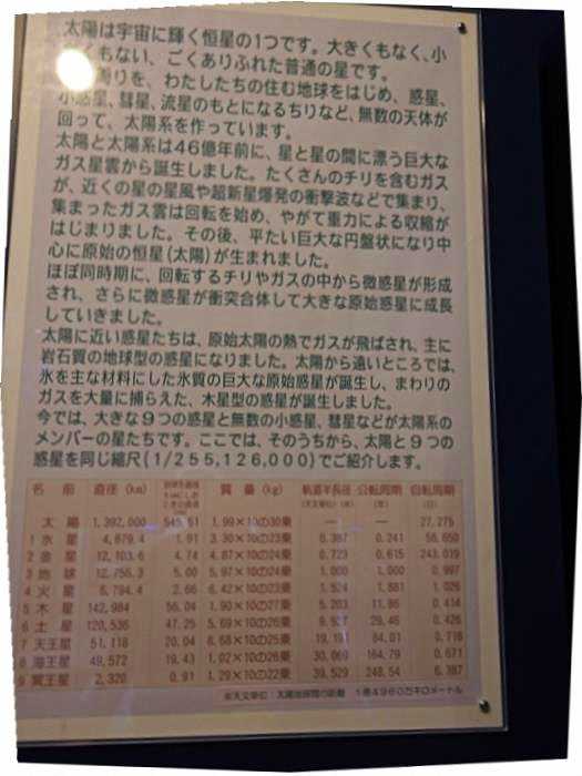 ここでは、そのうちから、太陽と9つの惑星を同じ縮尺(1/ 255,126,000 )でご紹介します。」