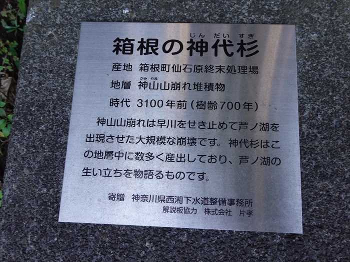 芦ノ湖を出現させました。この神代杉(ヒノキ)はこの堆積物中から産出したもので、芦ノ湖の