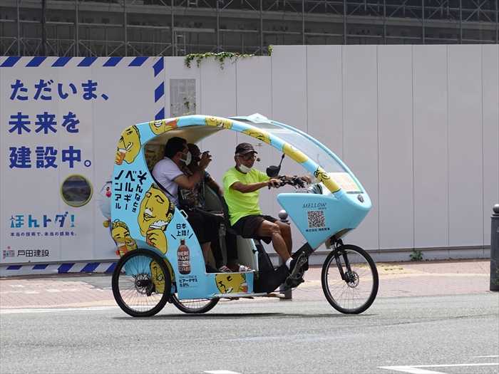 「万国橋」交差点には電動アシスト自転車タクシー「シクロポリタン」が走っていた。