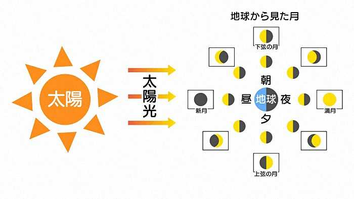 月に当たる太陽の光は一定なので、地球に昼と夜ができるのと同じように、月も明るい部分と