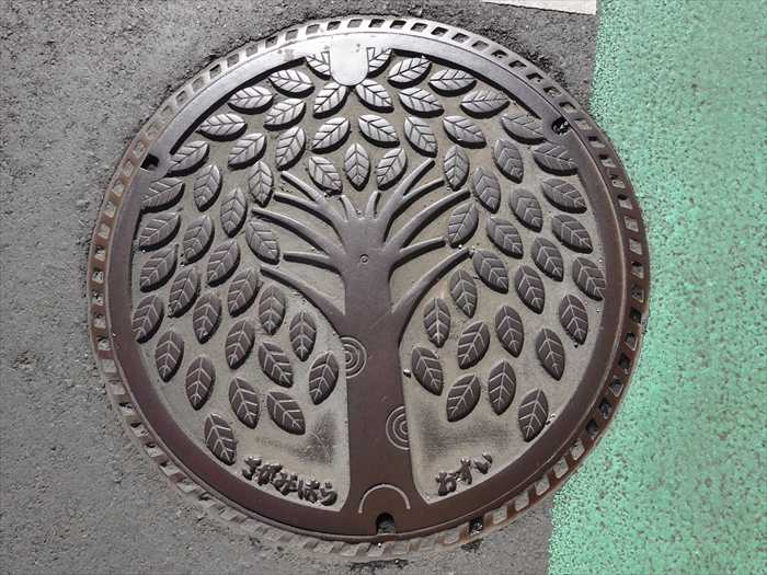 市の木「ケヤキ」をデザインした汚水用マンホール蓋。