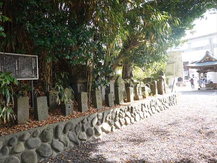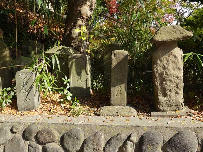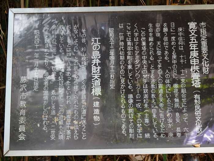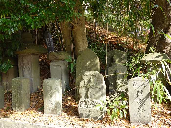 「江の島弁財天道標」が一番手前に。道標の横には、20数基の庚申塔群があった。