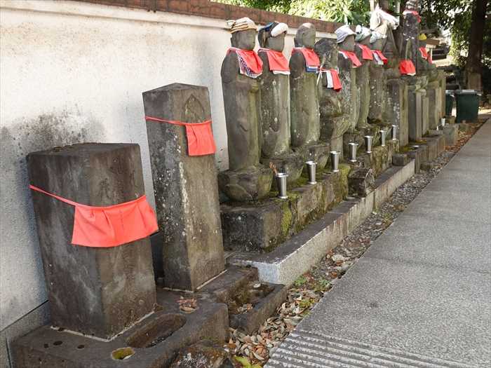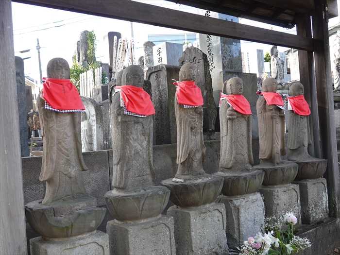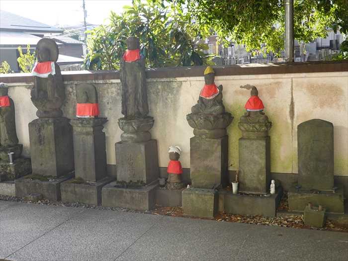 本堂の左横、墓地の前には石仏が並ぶ。