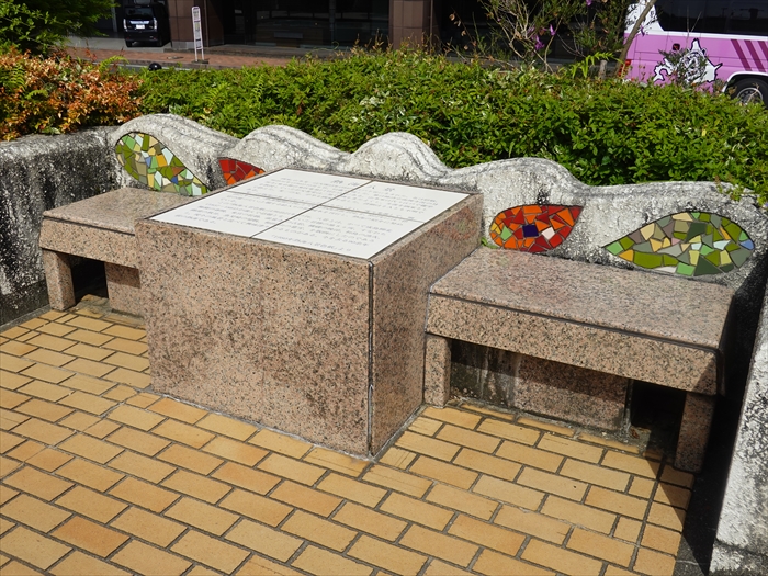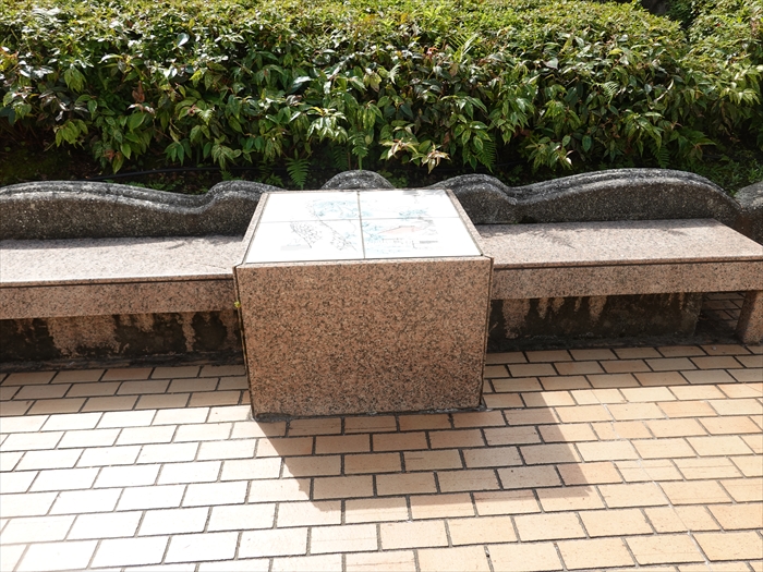 「サンデッキ広場」の植栽の間を歩くと左手にもベンチとタイル画があった。