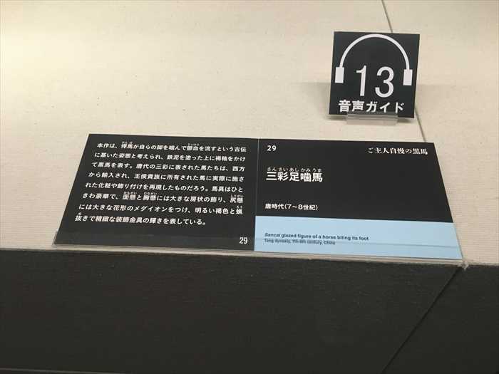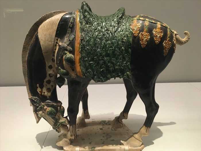 褐釉をかけて黒馬を表す。唐代の三彩に表された馬たちは、西方から輸入され、王侯貴族に所有された