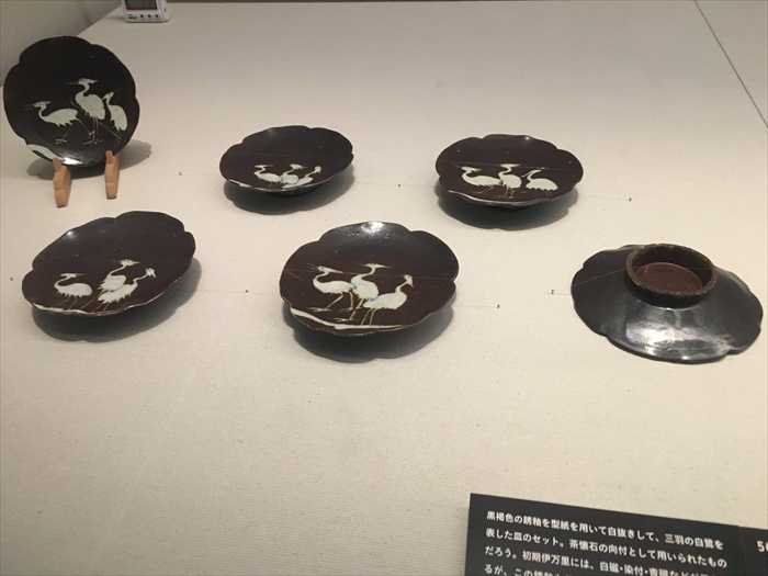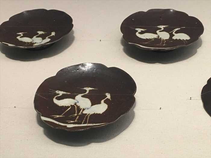 黒掲色の銹釉を型紙を用いて白抜きして、三羽の白鷺を表した皿のセット。茶懐石の向付として