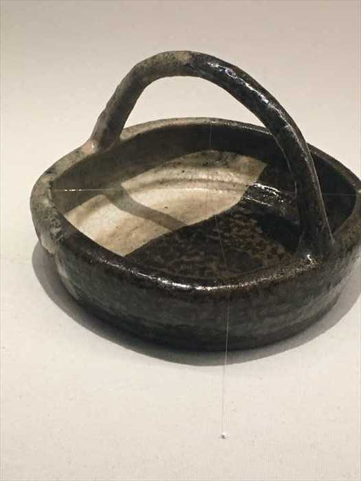 無造作に提げ手を渡した内抱えの鉢に、白と黒の片身替り の意匠をまとわせている。白濁する