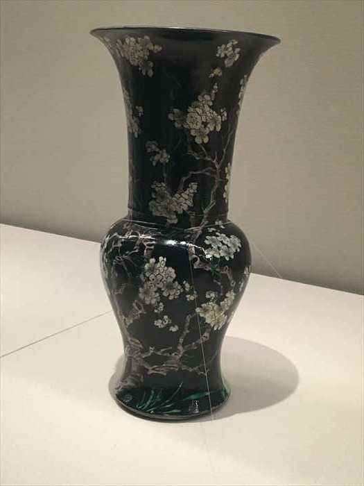 「鳳尾尊」と呼ばれている。育景を黒で塗り詰め、幹や枝に賦彩されている緑釉や紫釉を