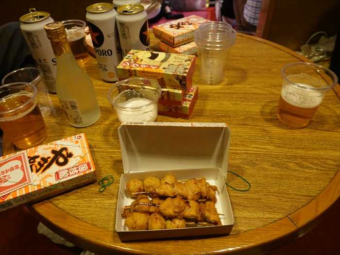 我々のテーブルには ビール、焼き鳥、焼売、巻き寿司 ・・・が。