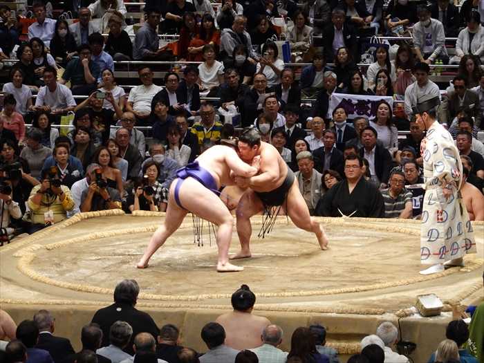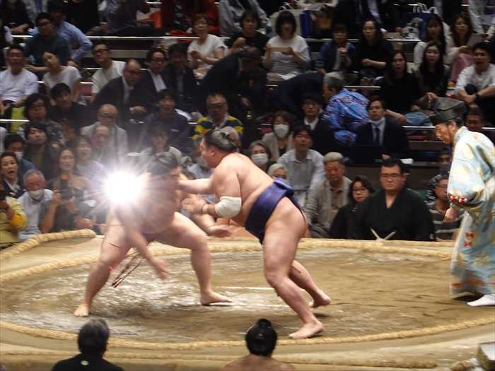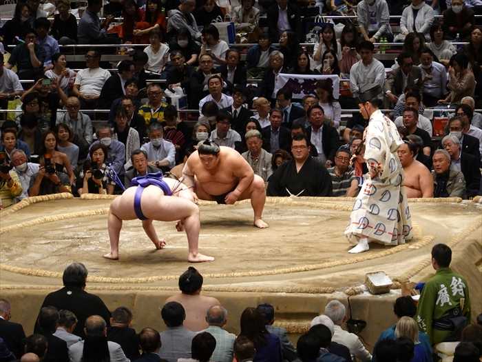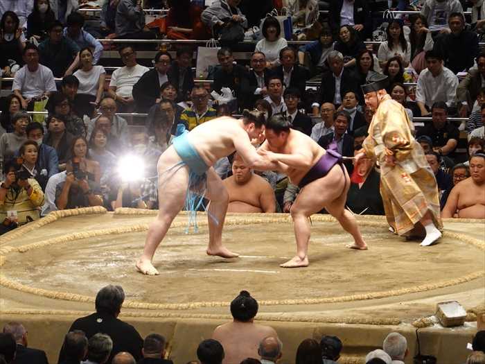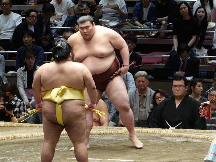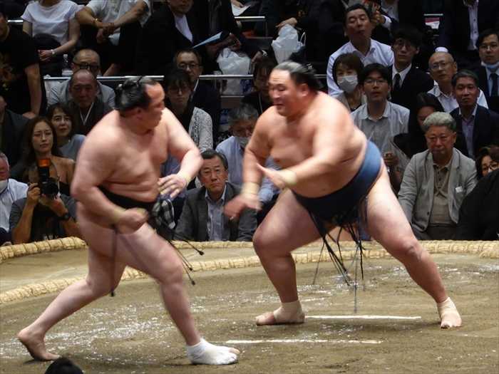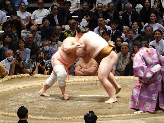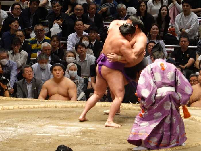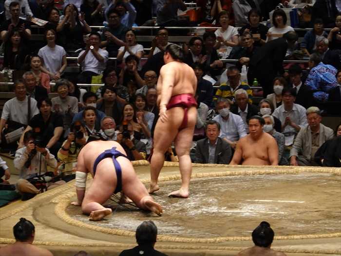 まっすぐ当たった遠藤は栃大海の引きにのめるも難なく残し、逆にいなして叩き込んで勝ち越し。