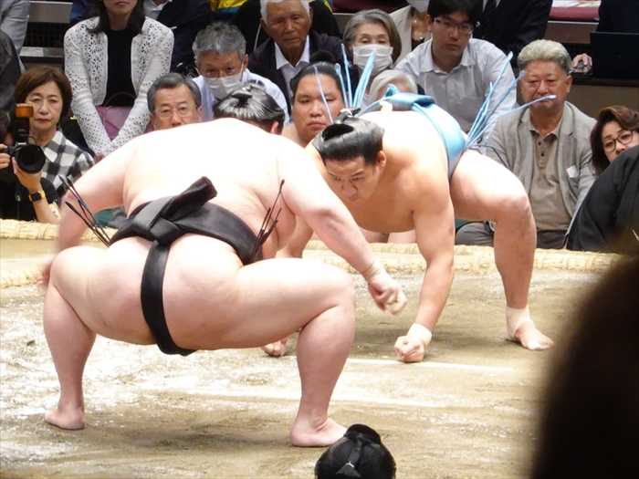 低く当たった若隆景即座右のぞかせて嫌っていなす朝紅龍の懷に飛び込み行司溜りに