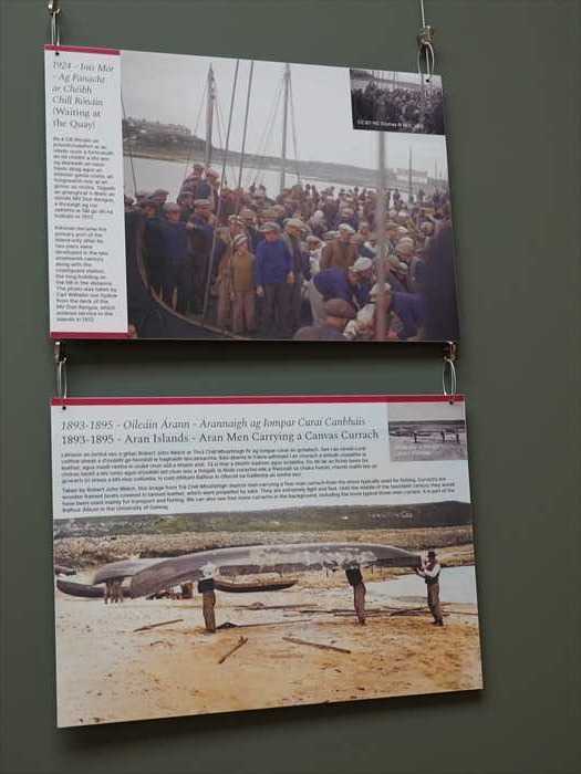 「1883-1885 ーAran Islands ーAran Men Carrying a Canvas Currach Taken by Robert John Welch,this image from Tra Chill Mhulrbhlgh depics men carring a four-men currach from the shore typically used for fishing. Currachs are wooden framed boats covered in tanned leather,whichi were propelled by oars.They are extremely light and fast. Until the middle of the twntieth century they would have been used mainly for transport and fishing.We can also see four currachs in the background,including the more typical three-man currach.It is part of the Balfour Album in the University of Galway.」