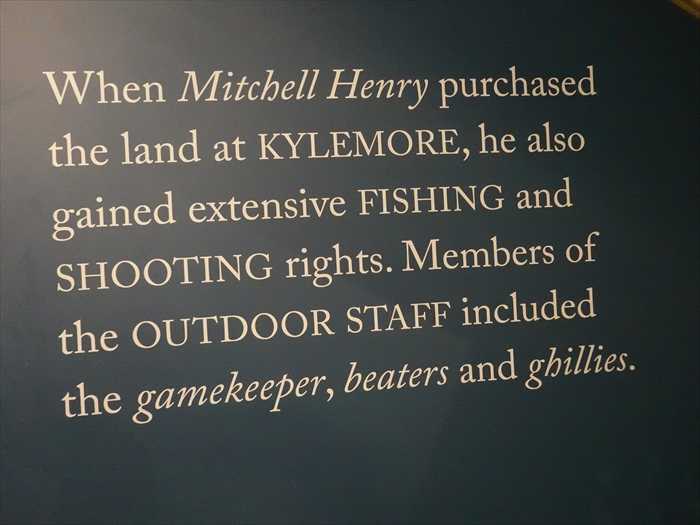 「When Mitchell Henry purchased the land at KYLEMORE, he also gained extensive FISHING and SHOOTING rights. Members of the OUTDOOR STAFF included the gamekeeper, beaters and ghillies.」
