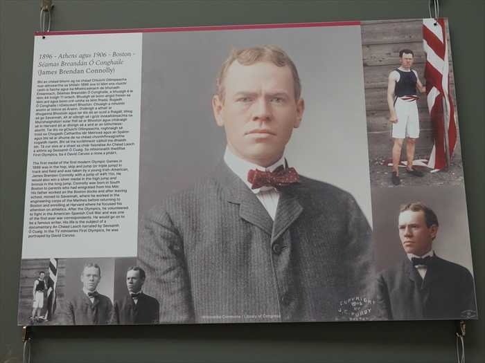 bronze in the long jump. ConnoIIy was born in South Boston to parents who had emigrated from lnis Mor.His father worked on the Boston docks and after leaving school, moved to Savannah,where he worked in the engineering corps of the Marines before returning to Boston and enrolling at Harvard where he focused his attention on athletics. After the Olympics, he volunteered to fight in the American-Spanish Civil War and was one of the first ever war correspondents. He would go on to be a famous writer. His life is the subJect of a documentary An Chéad Laoch narrated by Seosamh O Cuaig.In the TV miniseries First Olympics,he was portrayed by David Caruso.」